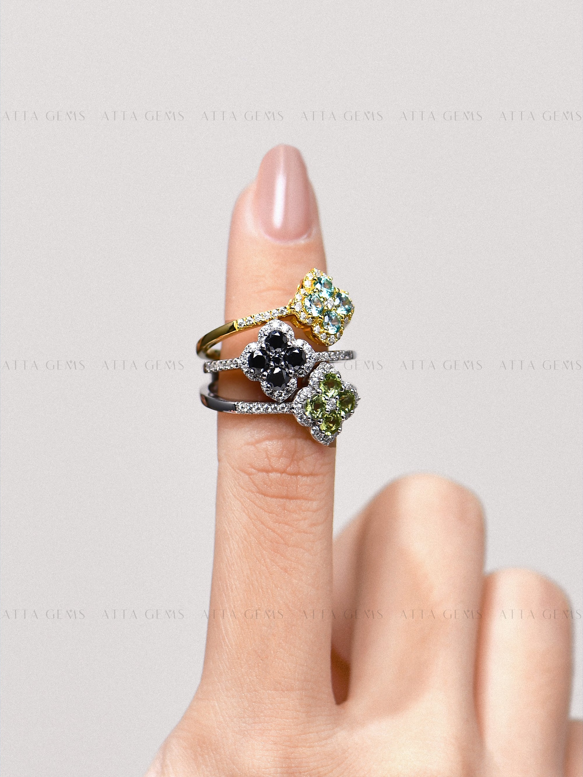 Gemstone & Design: Black Moissanite/White Moissanite/Peridot Gemstone/Paraiba Gemstone. Each stone hand-selected and micro-pavé set by master artisans.