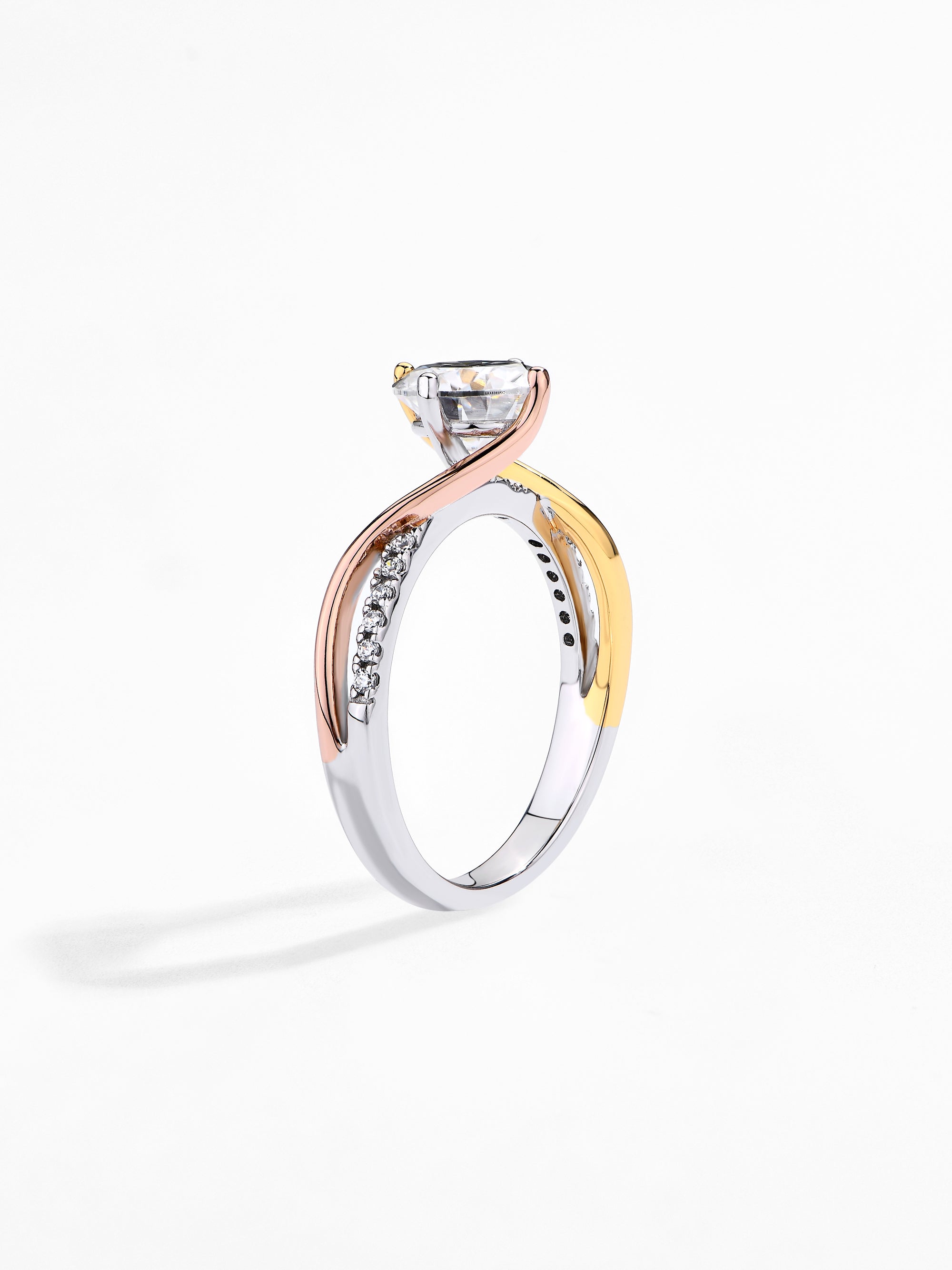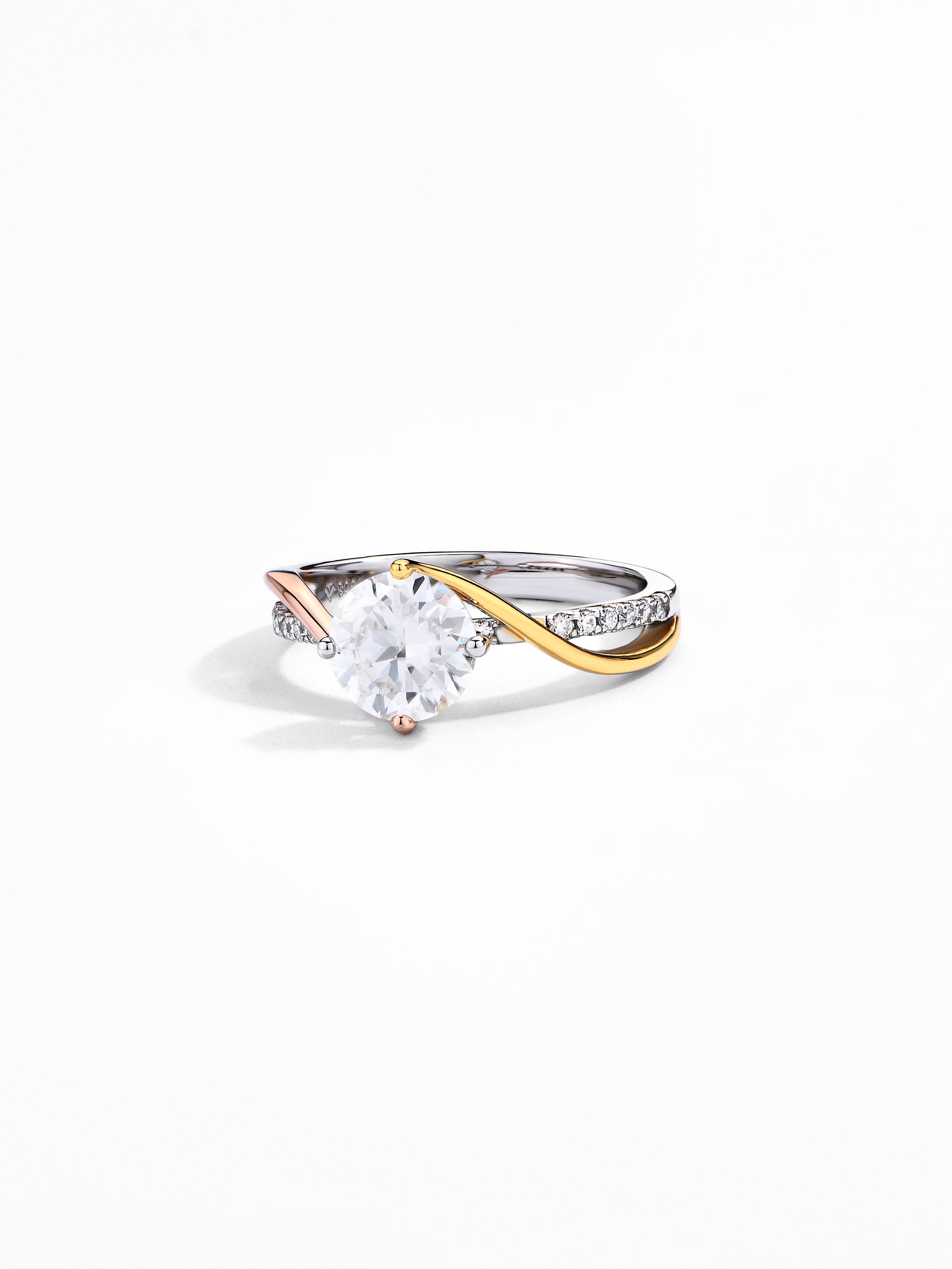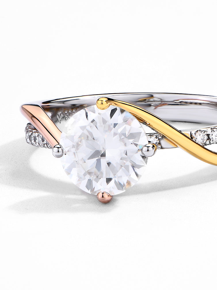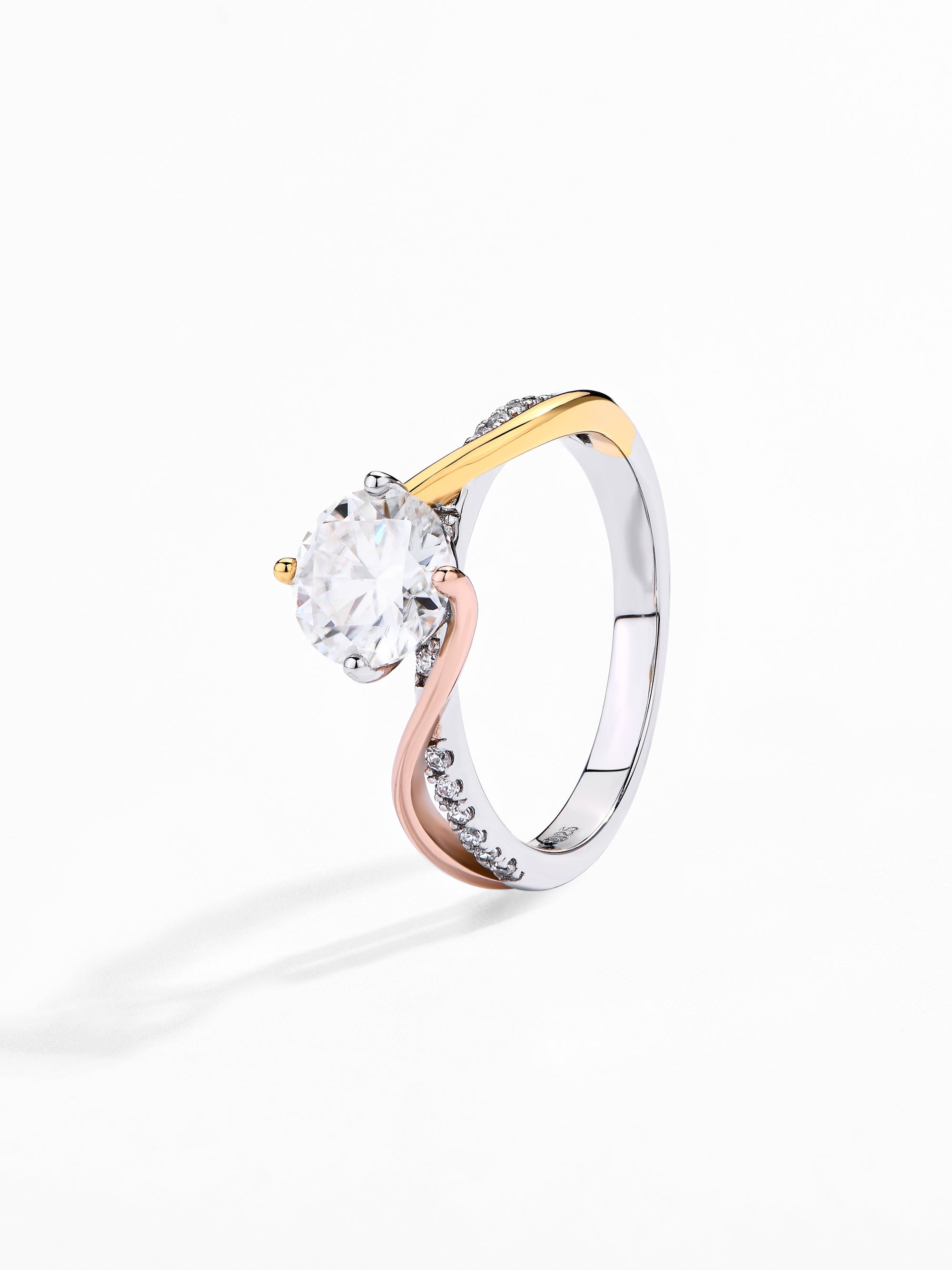 This eye-catching engagement ring features a stunning two-tone design and a tension setting that puts the focus on the dazzling 1.50 ct moissanite diamond. Stand out from the crowd with this one-of-a-kind piece. #R004
