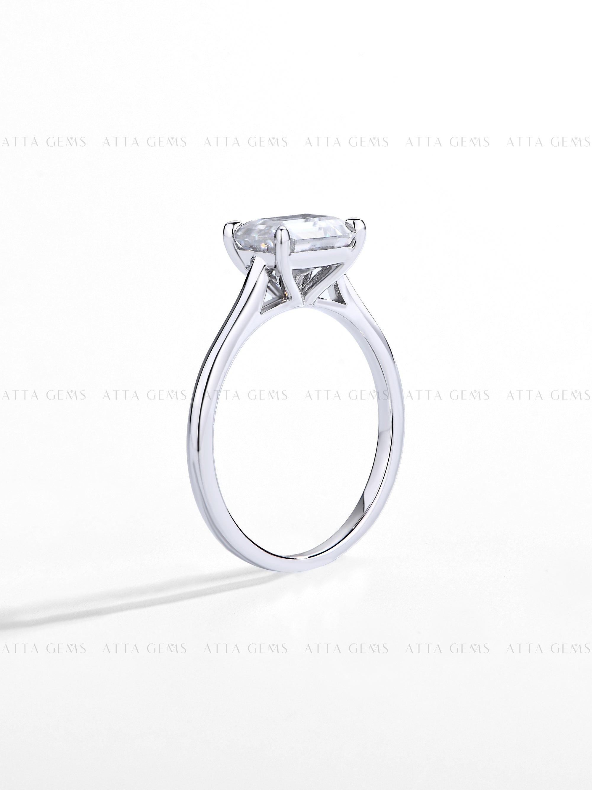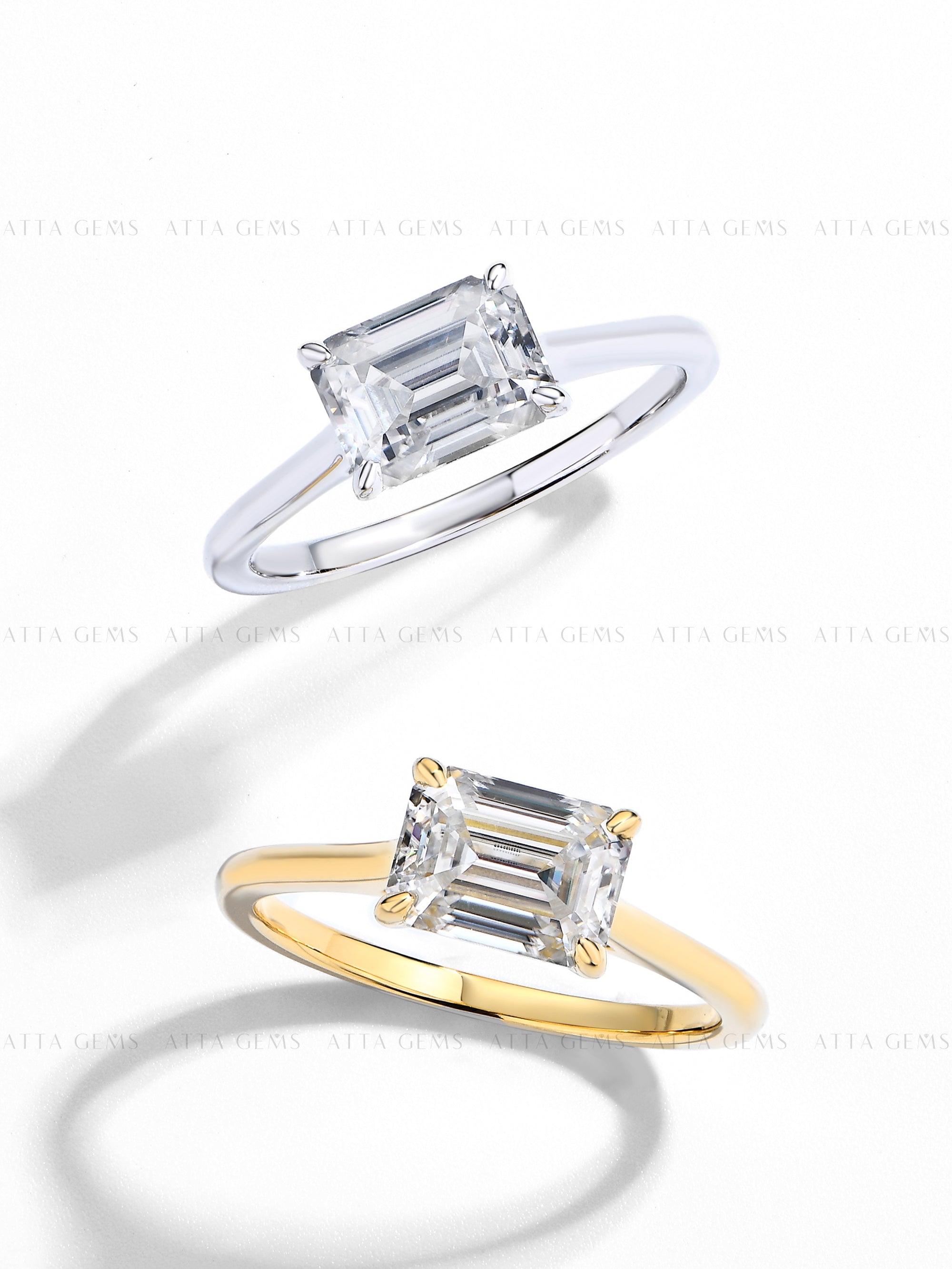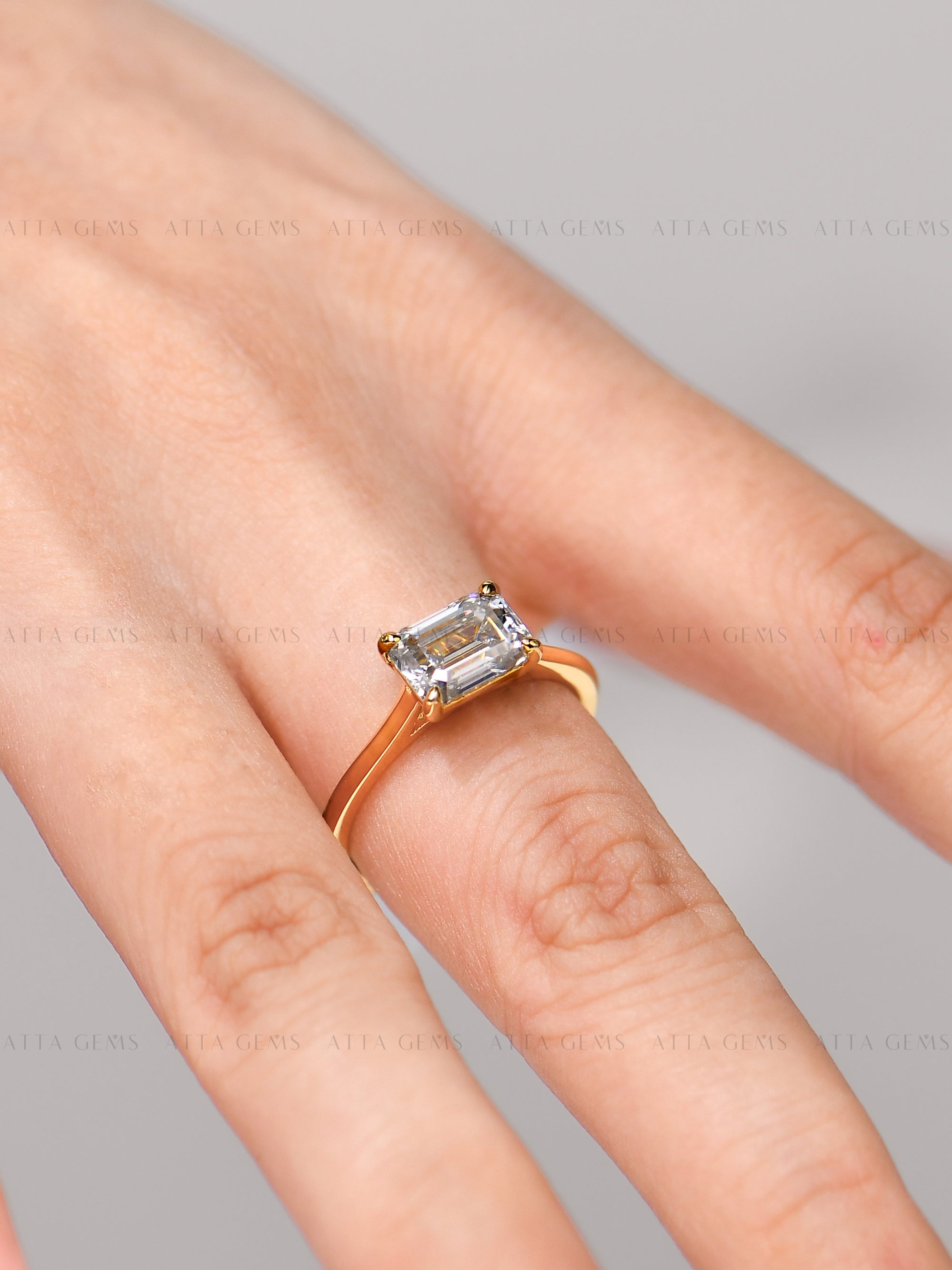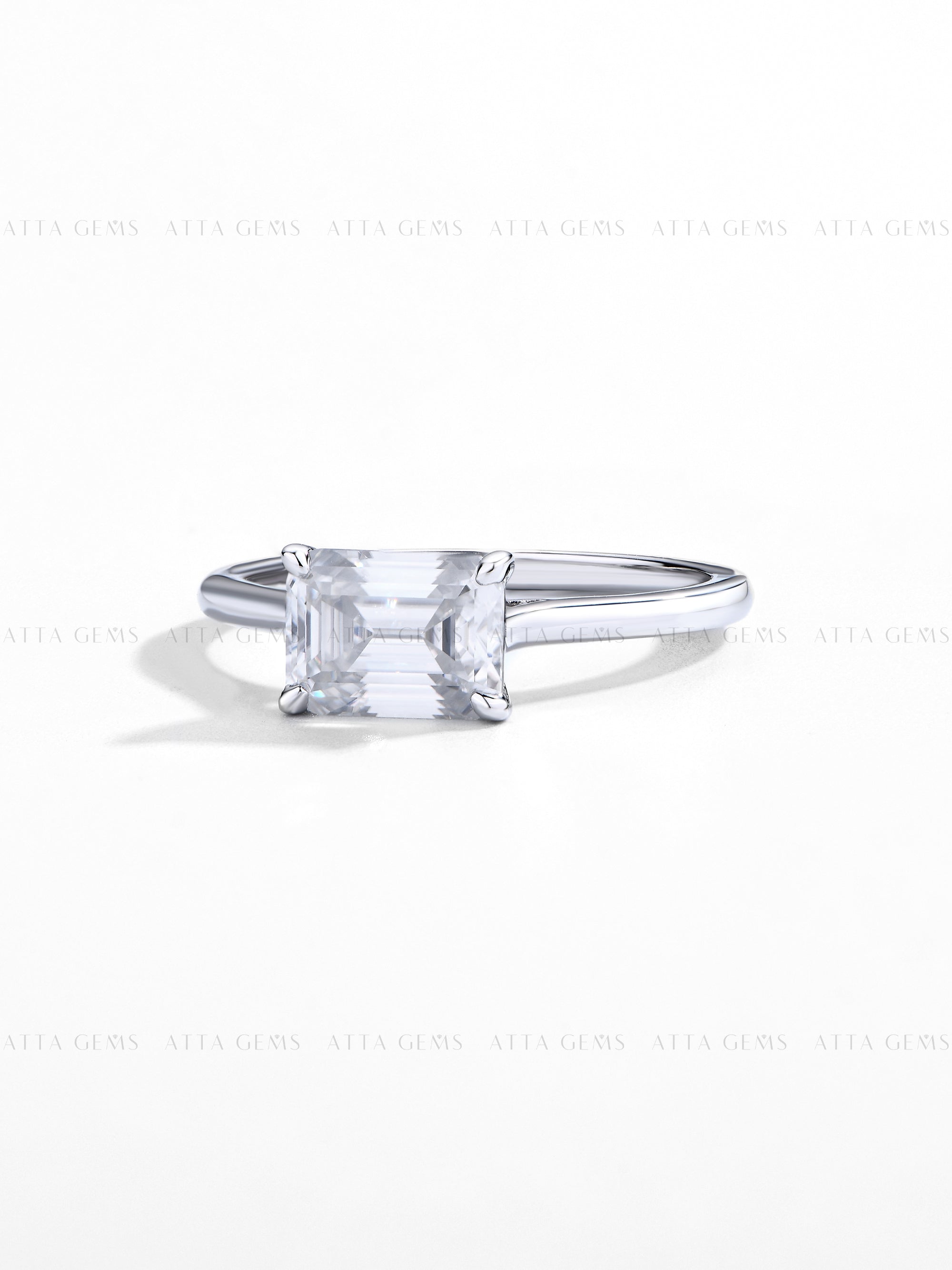 Take your love to new dimensions with 2ct east to west emerald solitaire Ring! Featuring an emerald cut moissanite diamond in a 4-prong setting, this ring is perfect for a bold statement of commitment and love.