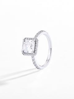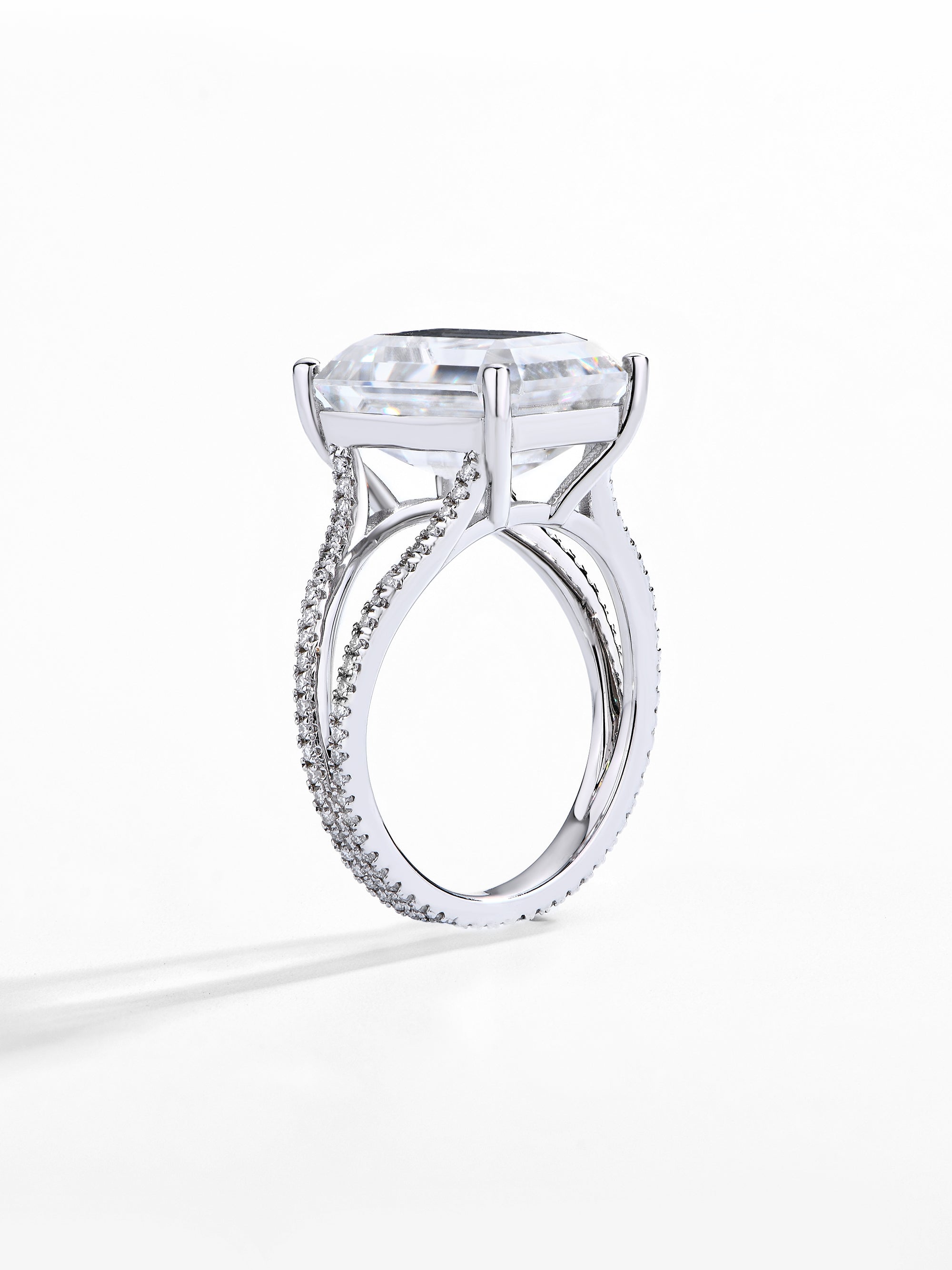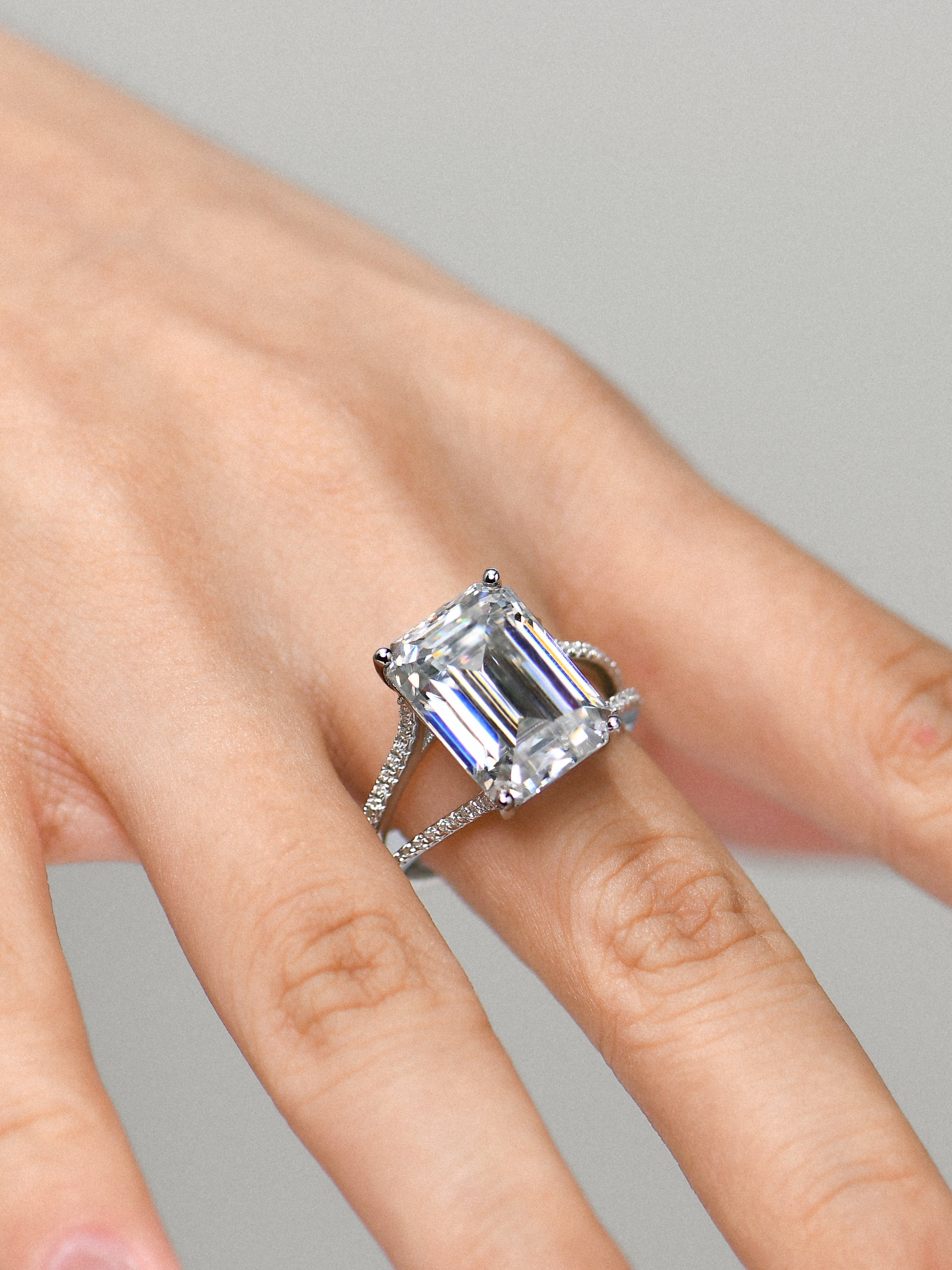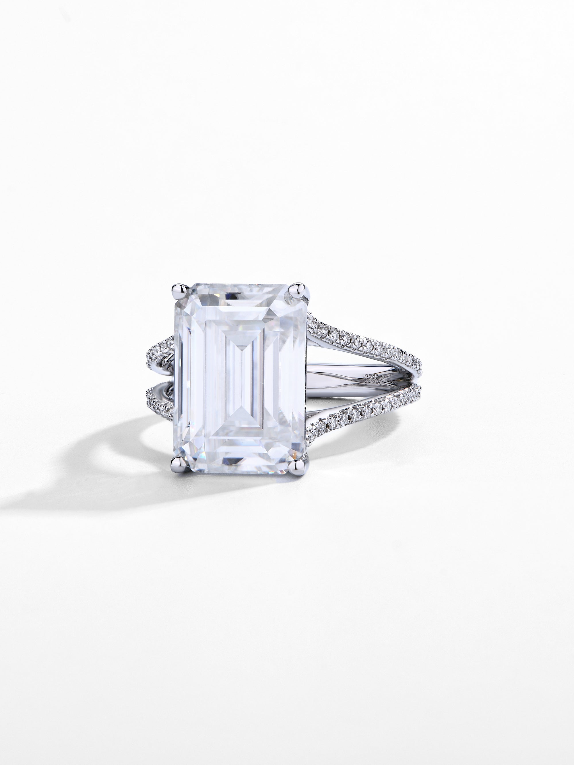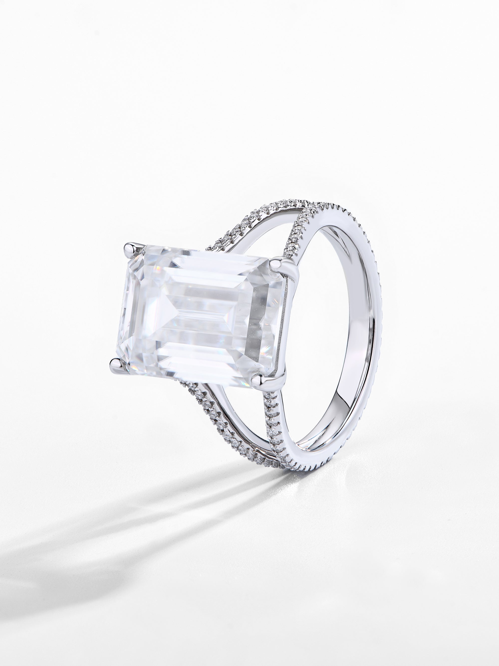 ● Setting: The solitaire setting allows the emerald cut moissanite to take center stage, with the hidden halo adding a subtle and sophisticated touch.