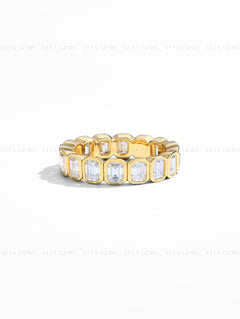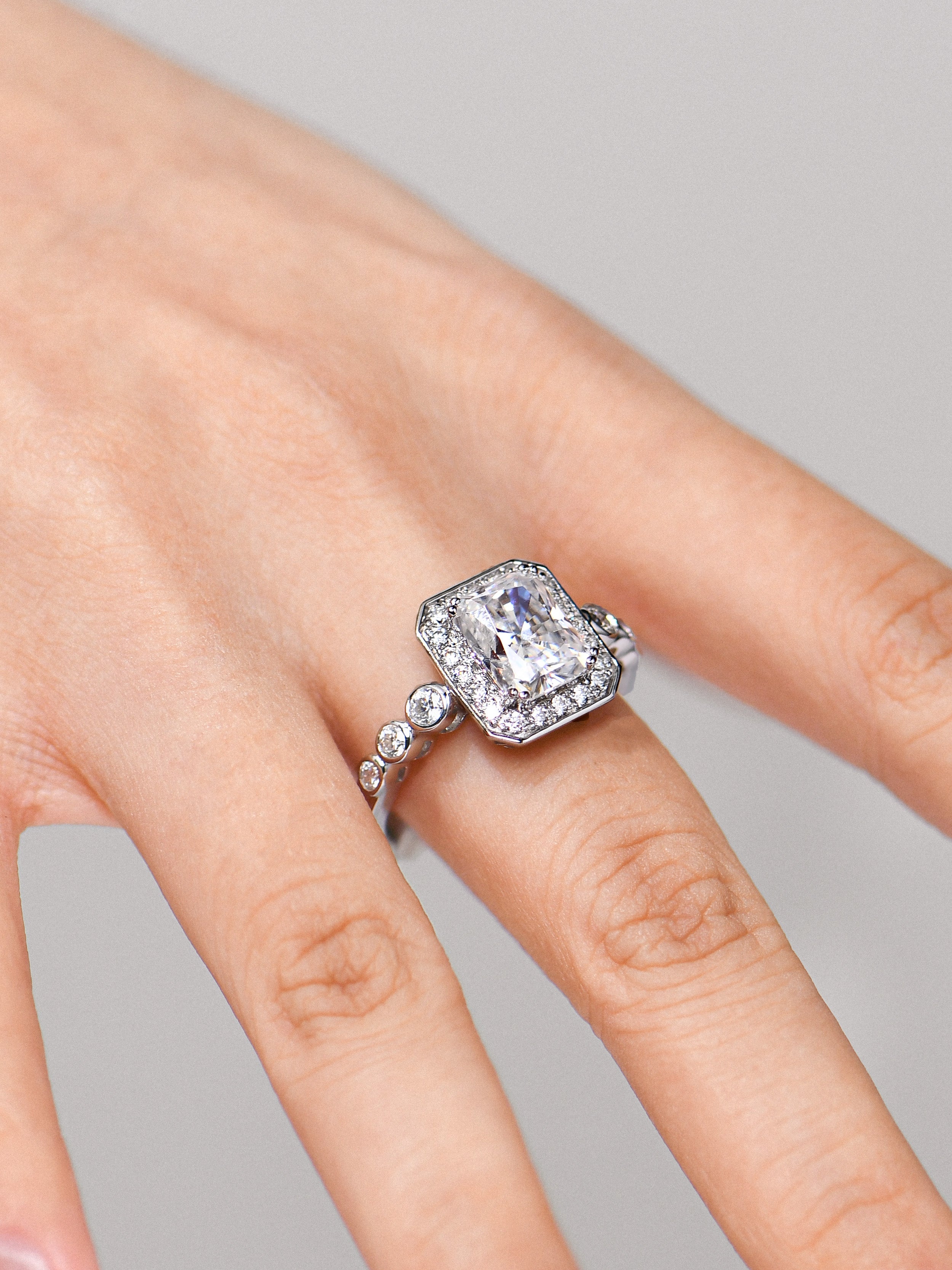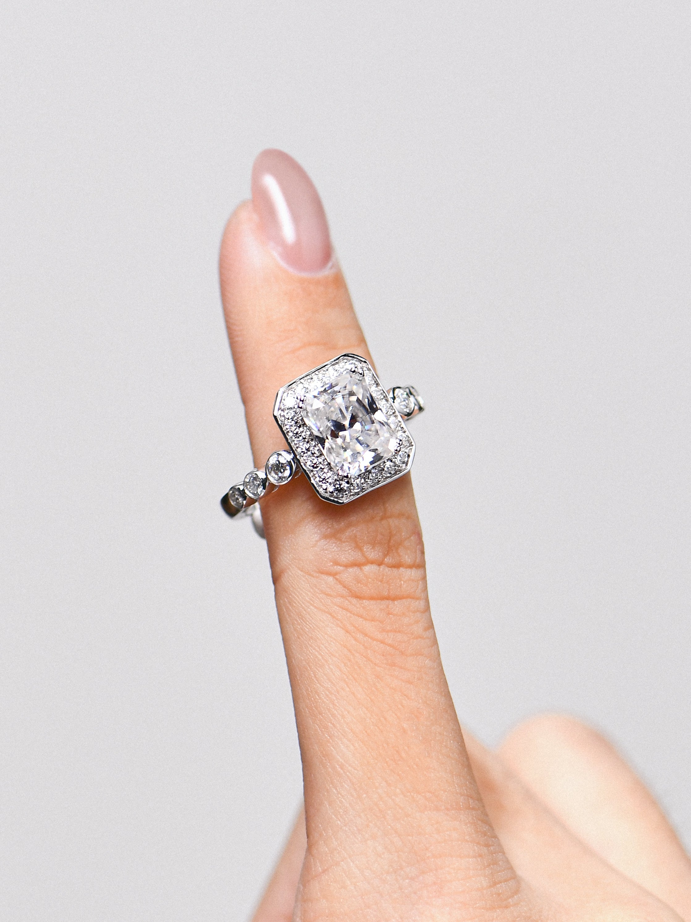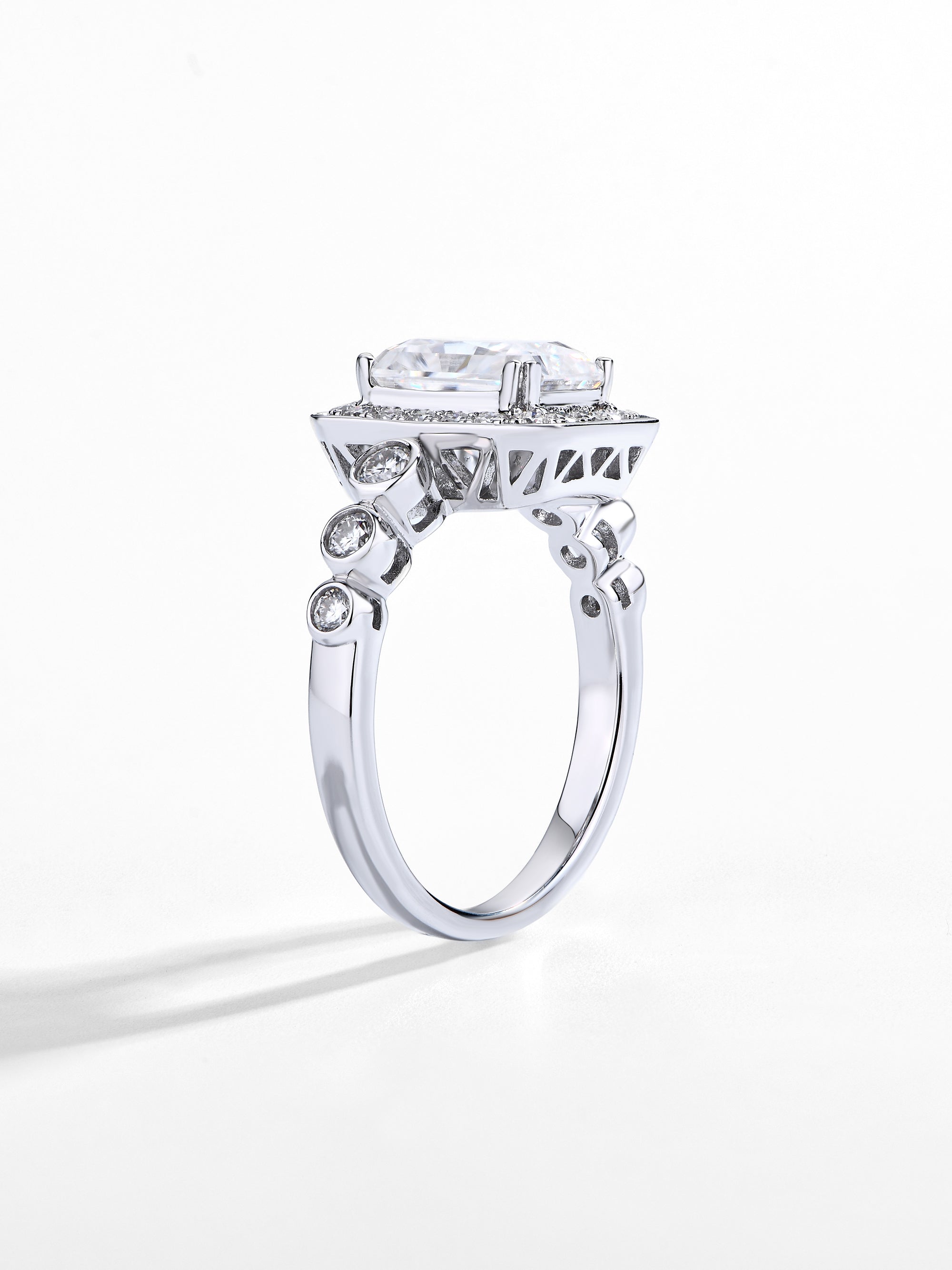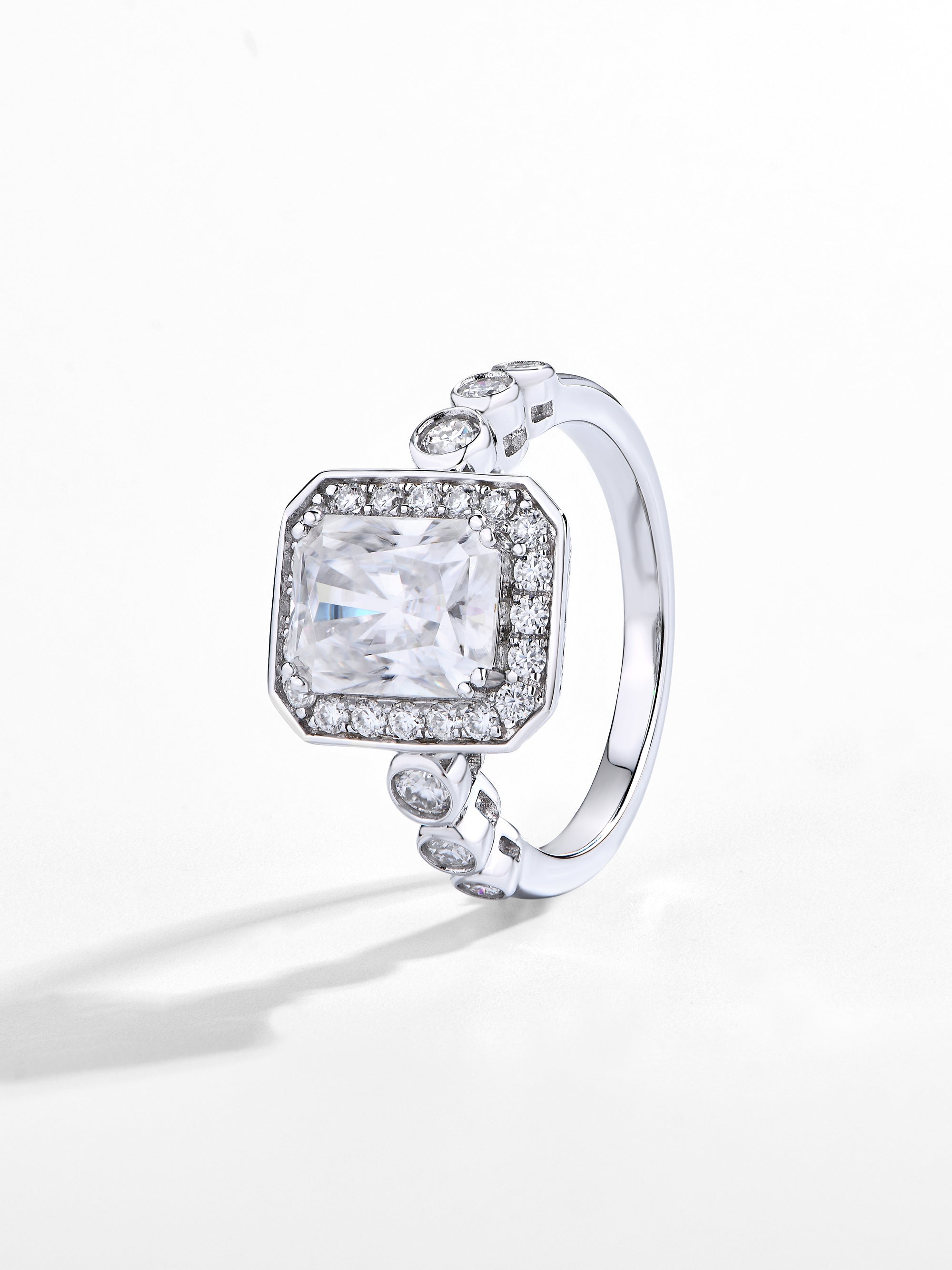 Craftsmanship & Design: Main stone 9*7mm 3ct emerald cut with side stone 1.5-2.5mm full moissanite. Each stone hand-selected and micro-pavé set by master artisans.