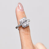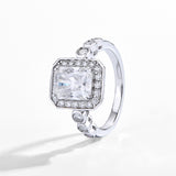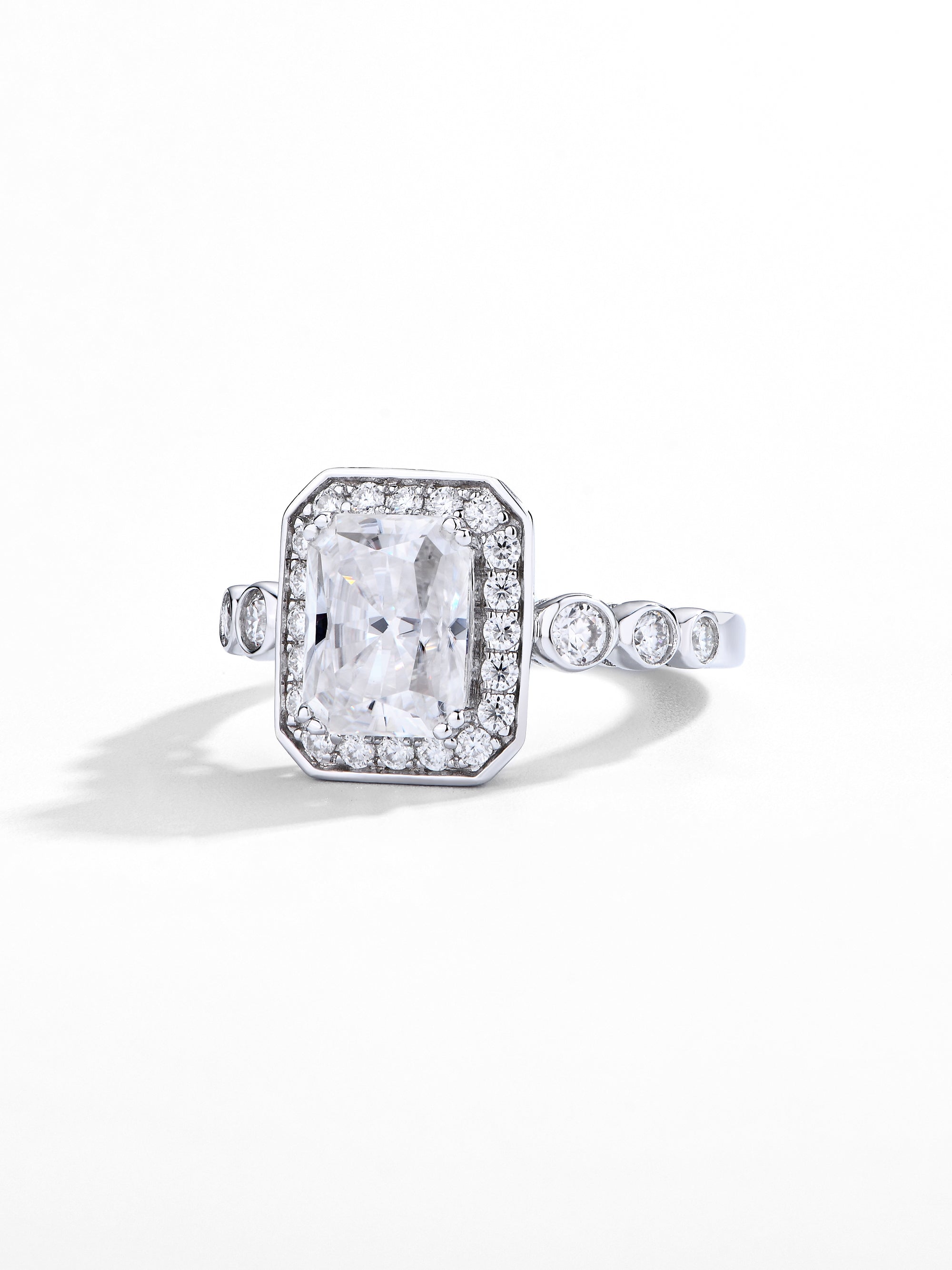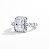 Expertly crafted with an emerald cut moissanite diamond, this halo style engagement ring will leave a lasting impression. The elegant design showcases the diamond's brilliance, while the halo setting adds to its sparkle. Perfect for those looking for a timeless and sophisticated ring.
