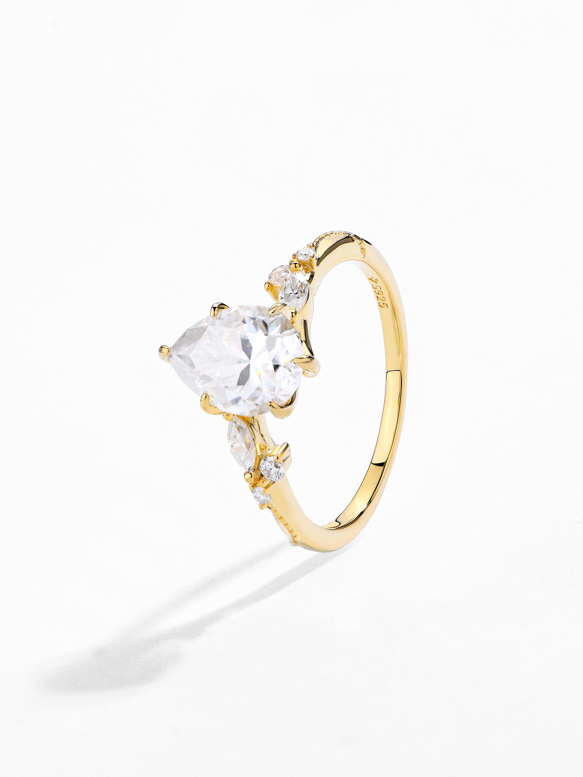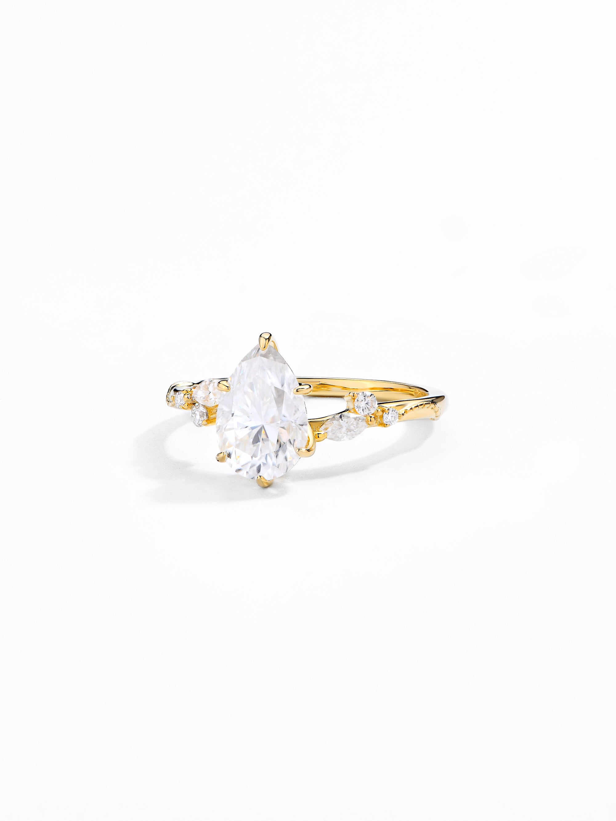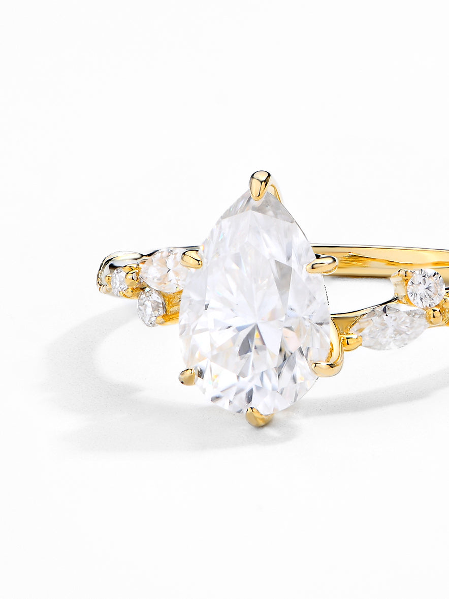 Craftsmanship & Design: Main stone pear moissanite 10*7mm 2ct with full moissanite diamonds. Each moissanite stone hand-selected and micro-pavé set by master artisans.