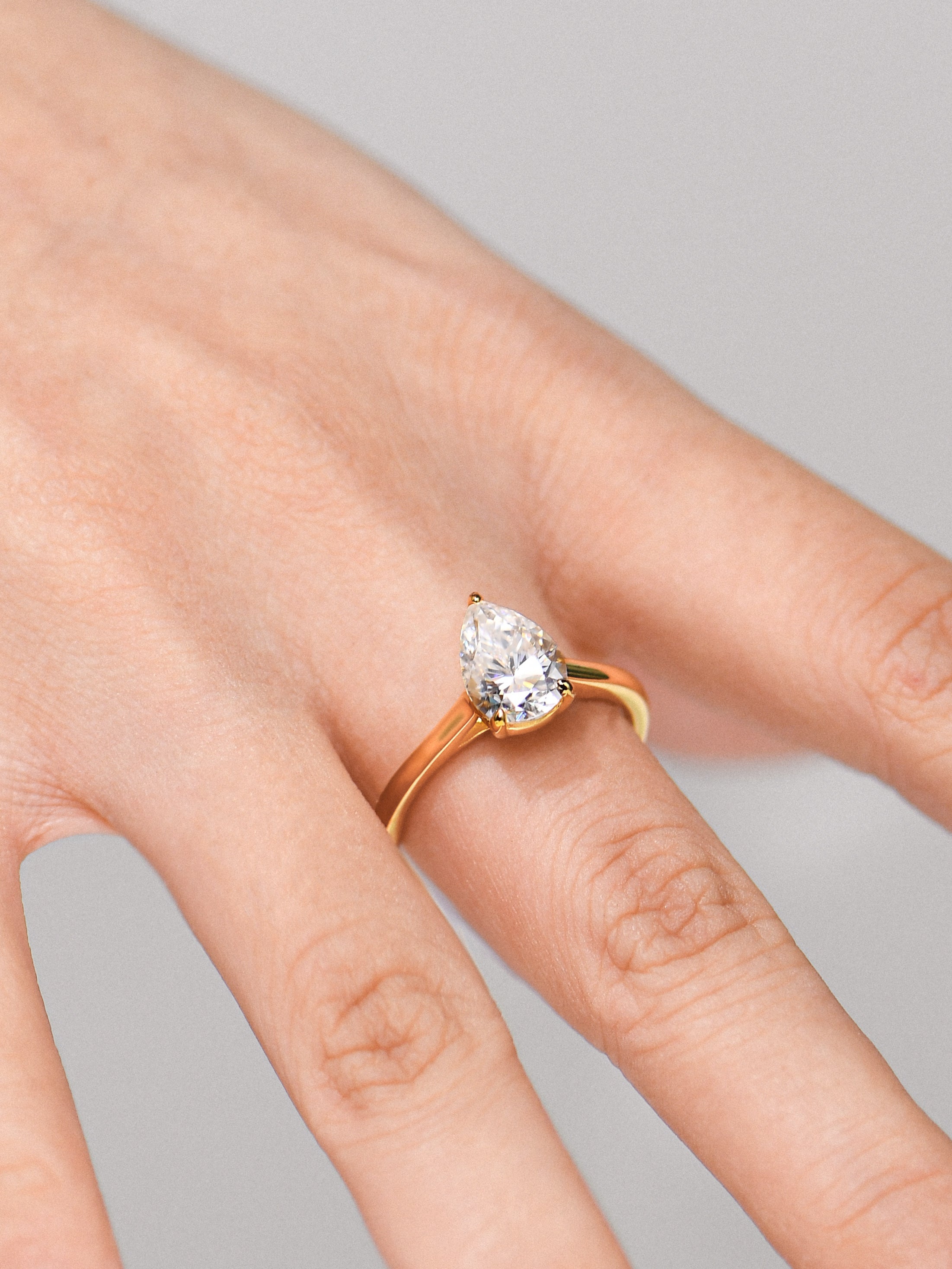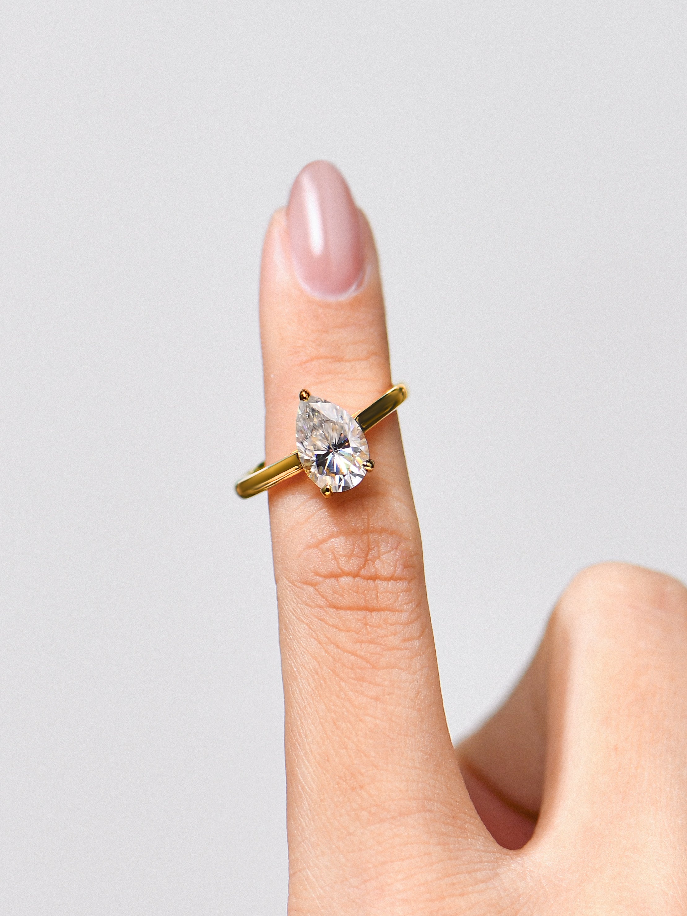 With its three-prong pear cut design, this ring showcases a stunning 2.0 carat moissanite diamond, offering exceptional brilliance and fire. A timeless piece that will elevate any outfit and make the perfect addition to your jewelry collection.#R148