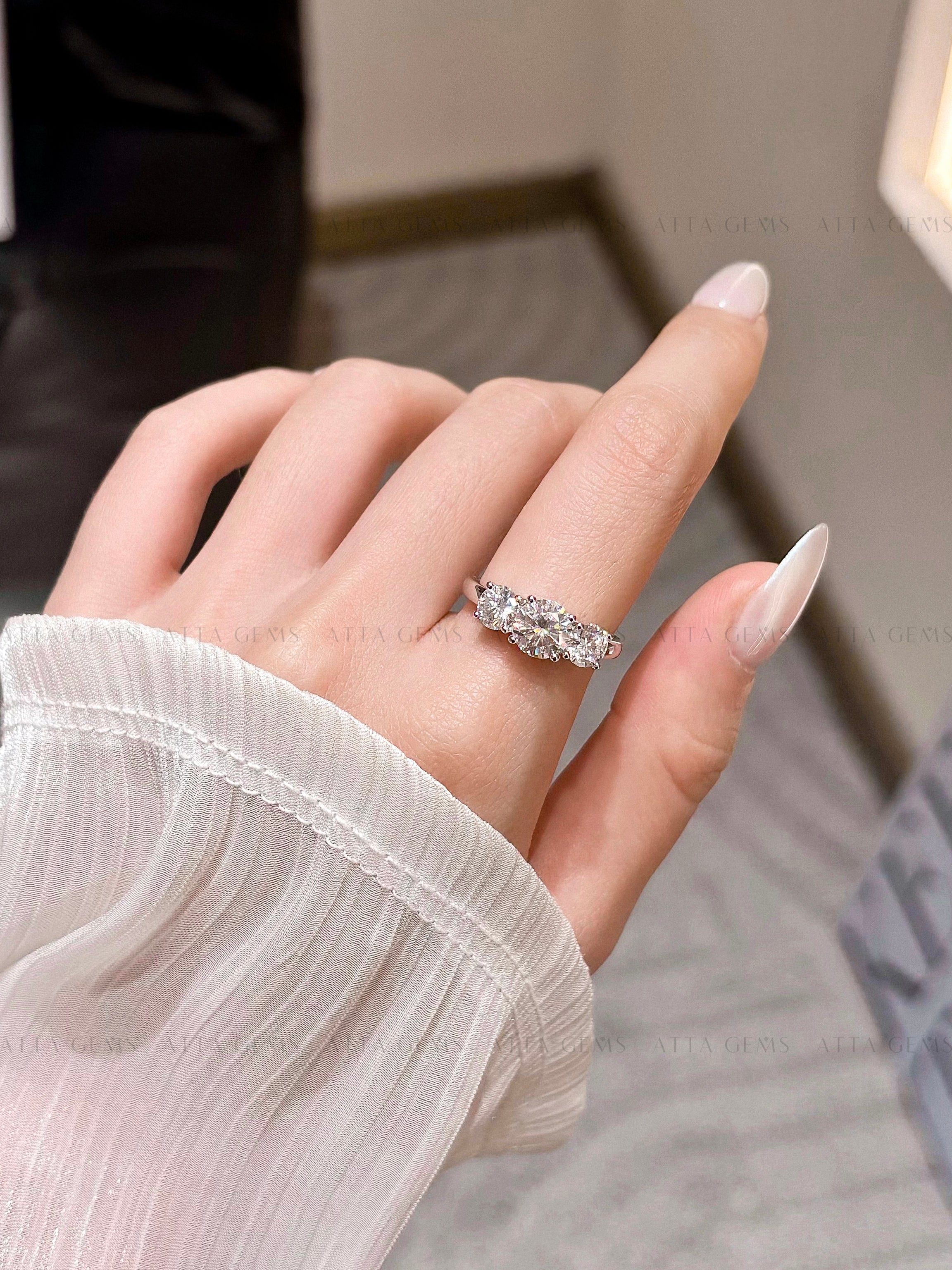 Three stone round moissanite diamond engagement ring features a classic three-stone design that symbolizes the past, present, and future of your relationship. With its brilliant round moissanite diamonds, this ring provides maximum sparkle and shine.  #R014