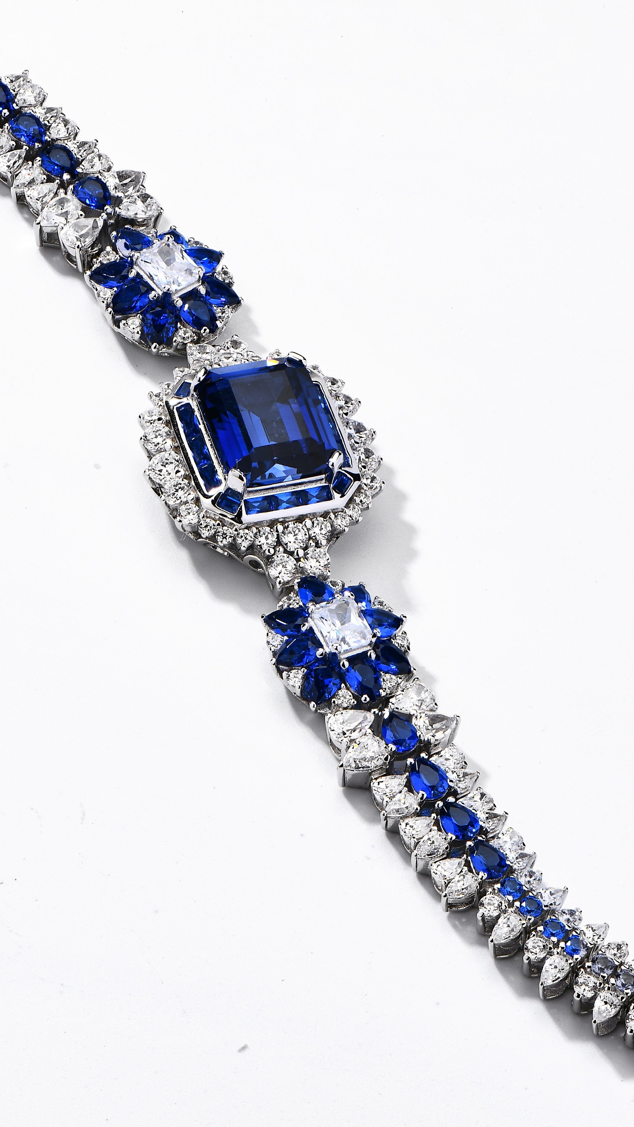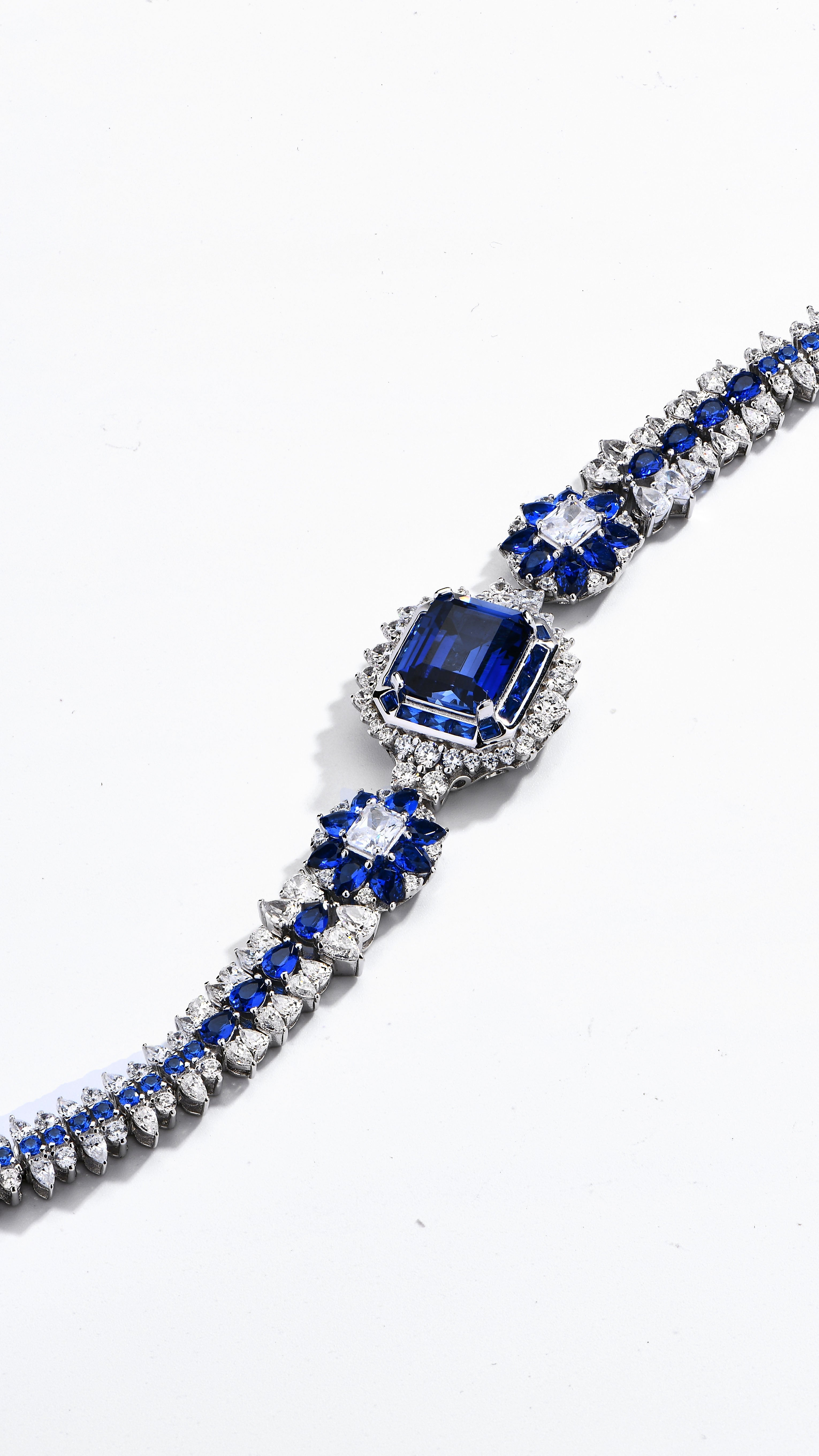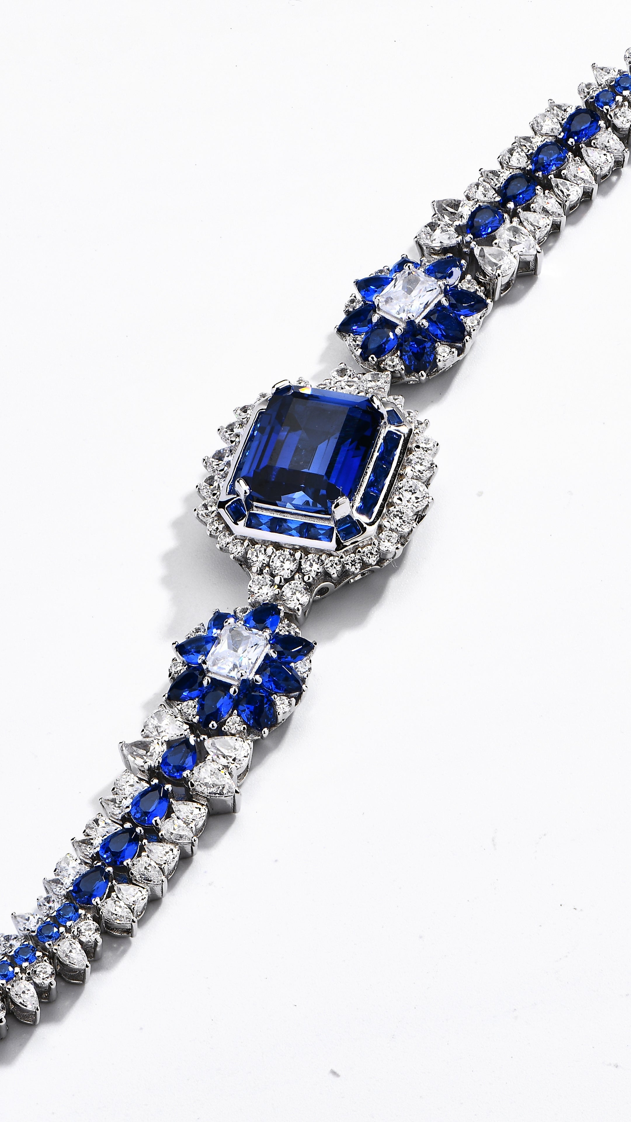 Craftsmanship & Design: Main stone emerald cut blue sapphire and side stones cz and spinel gemstone. Each stone hand-selected and micro-pavé set by master artisans.