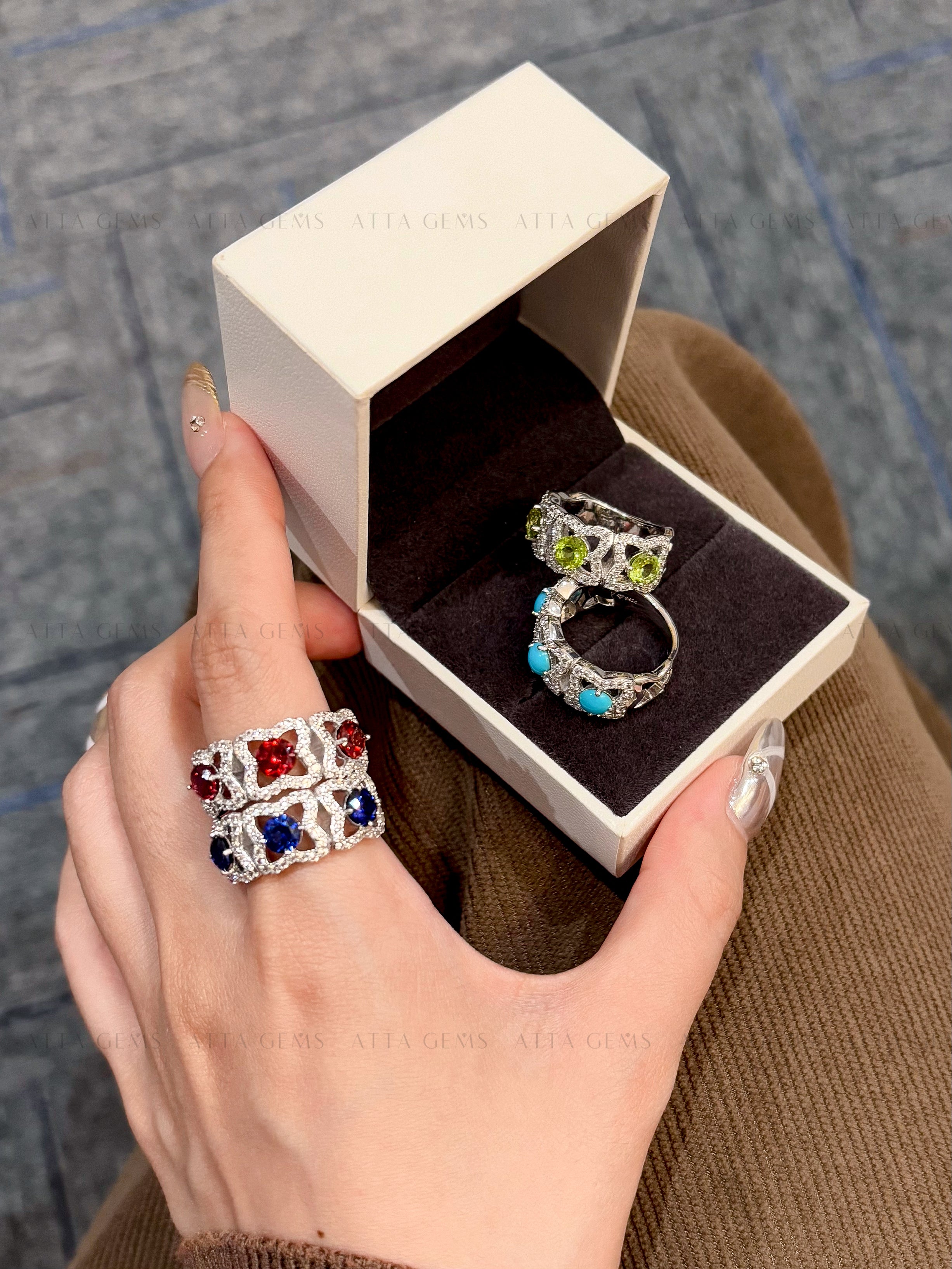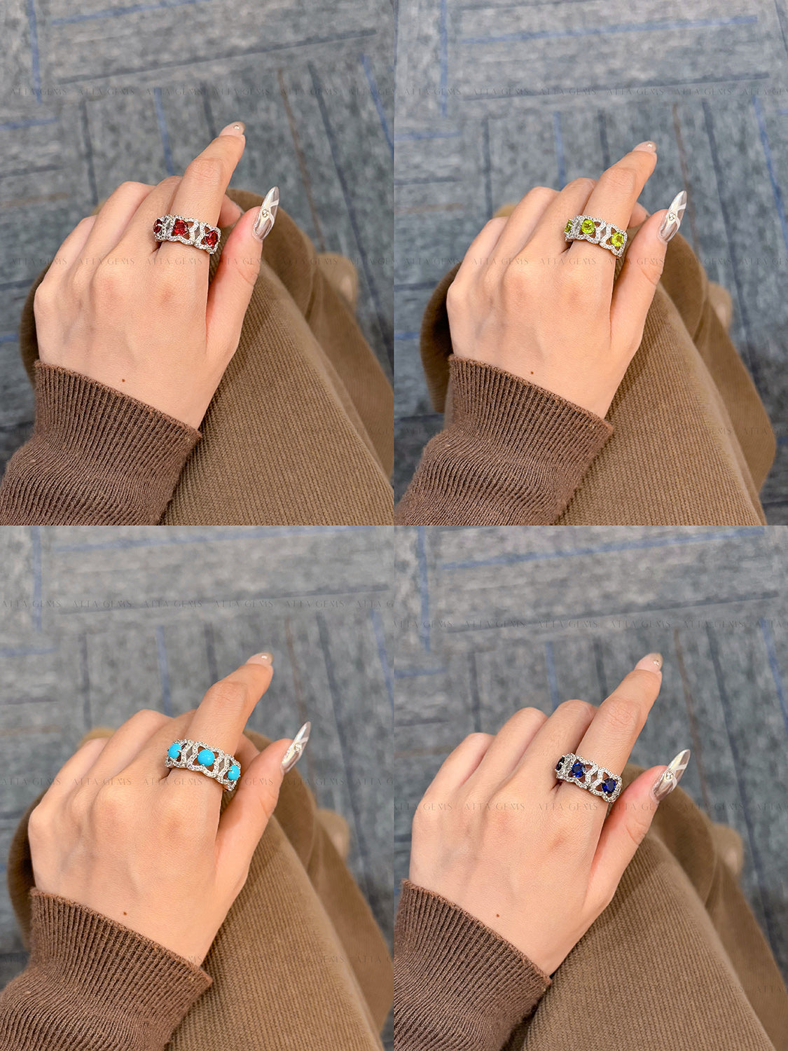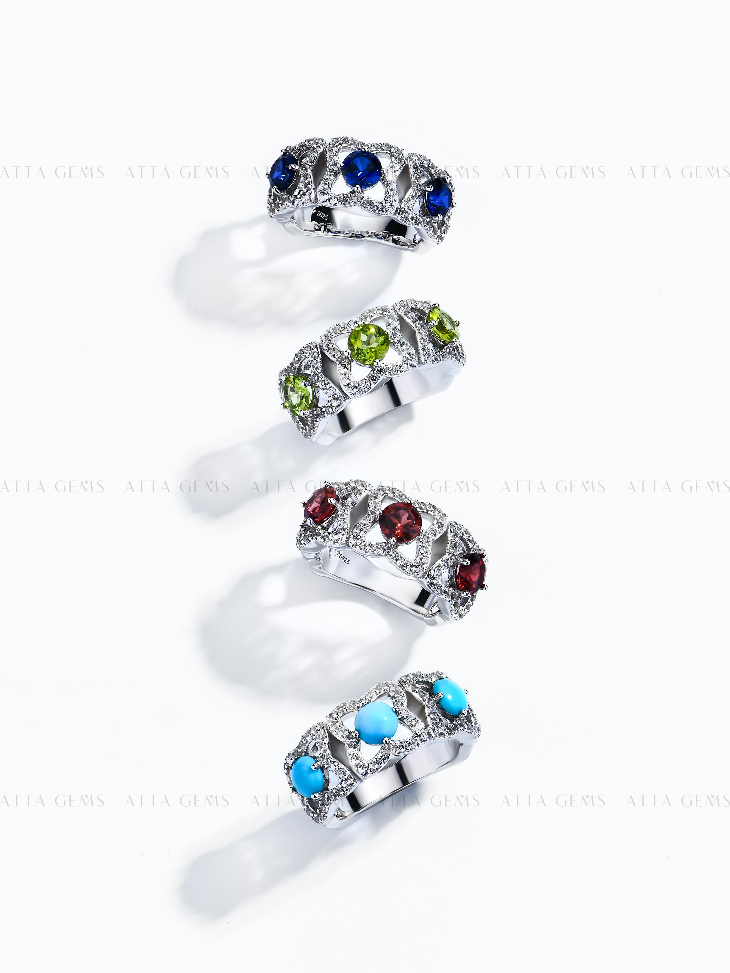 Adorn your hand with celestial hues—sapphire’s midnight, garnet’s fire, peridot’s dawn, turquoise’s ocean.
