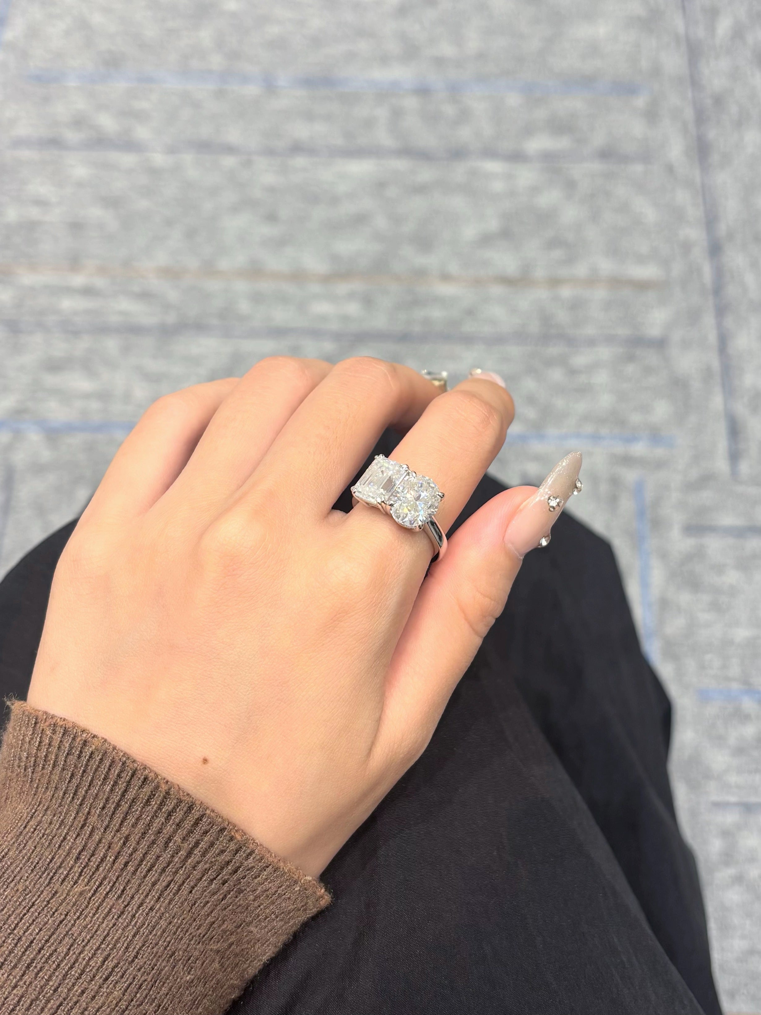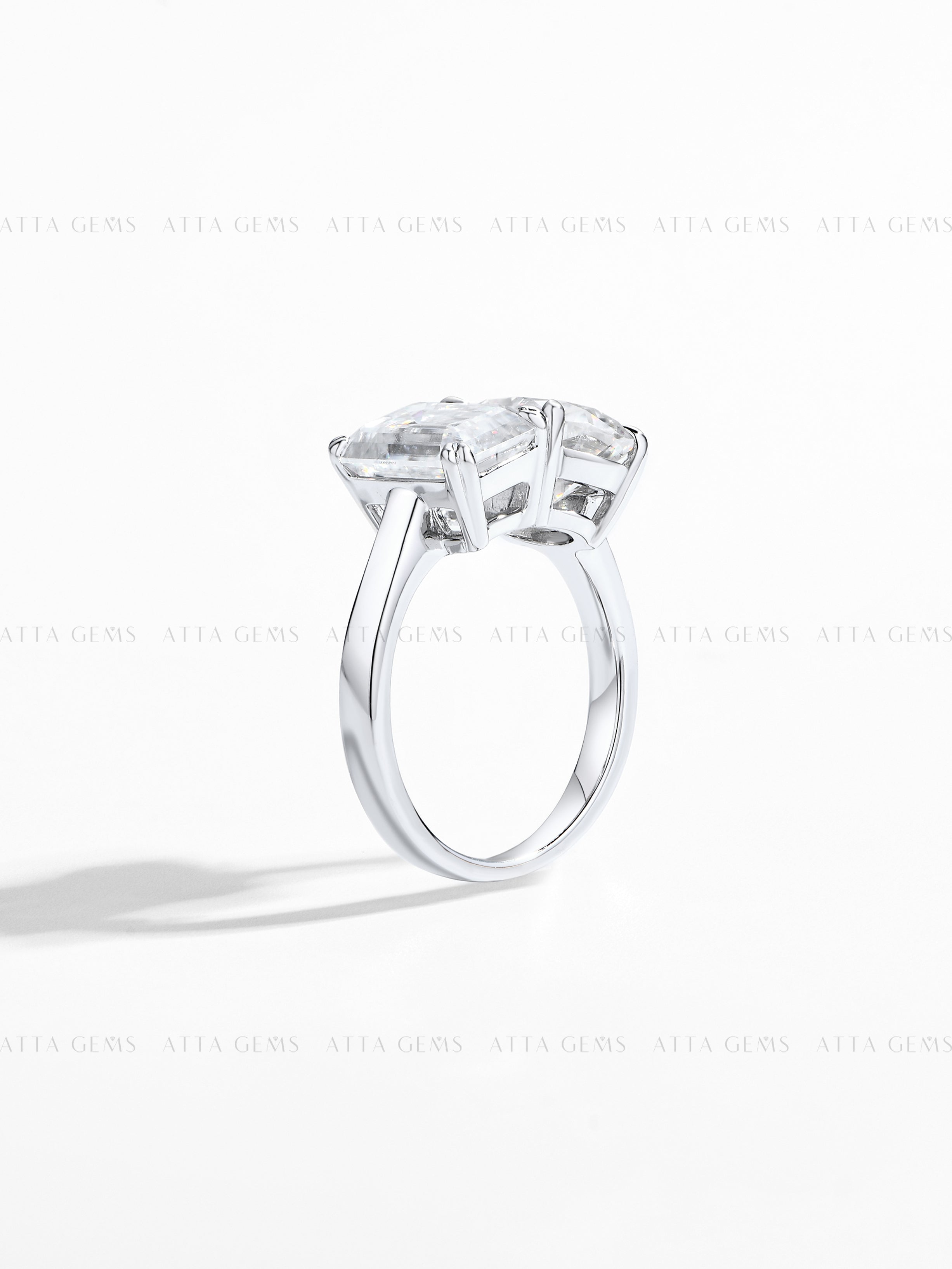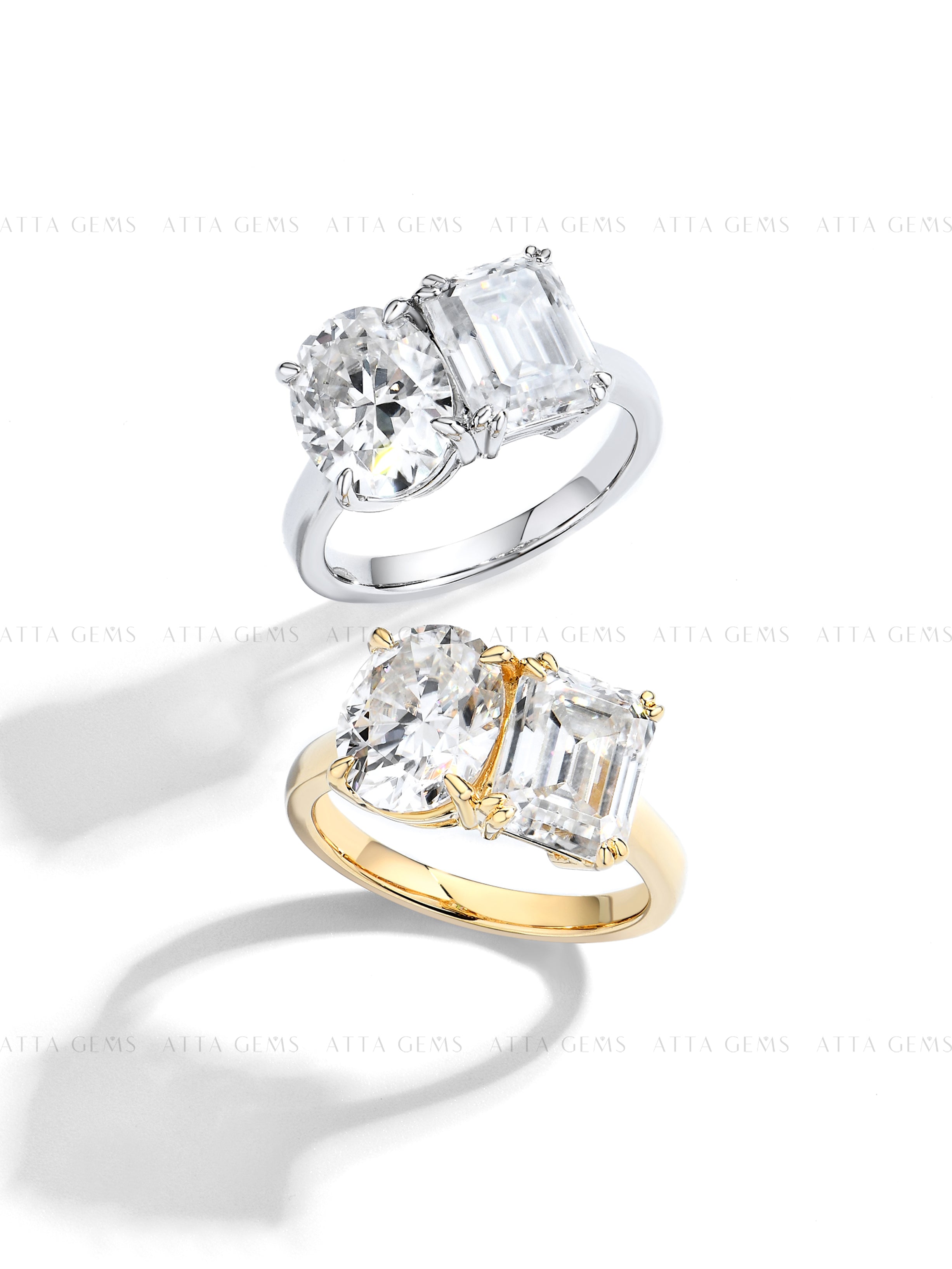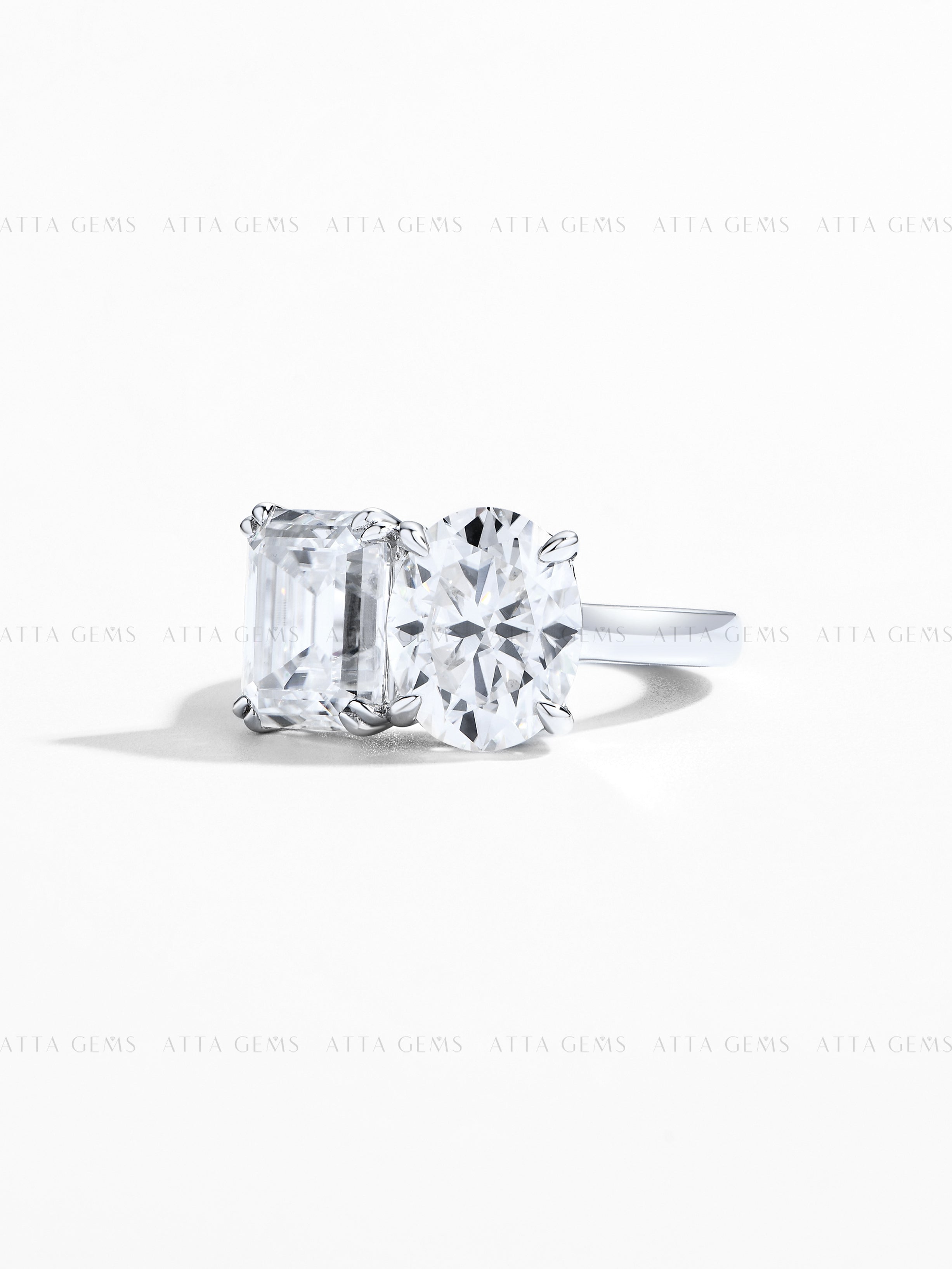 The Round and Emerald Toi-et Moi Ring is a unique and romantic engagement or anniversary ring, featuring a distinctive two-stone design. It showcases a round cut and an emerald cut moissanite diamond set side by side, symbolizing the union of two souls. This Toi-et Moi ring is perfect for celebrating milestones or marking the beginning of a lifelong journey together, with its elegant and timeless appeal. #R252