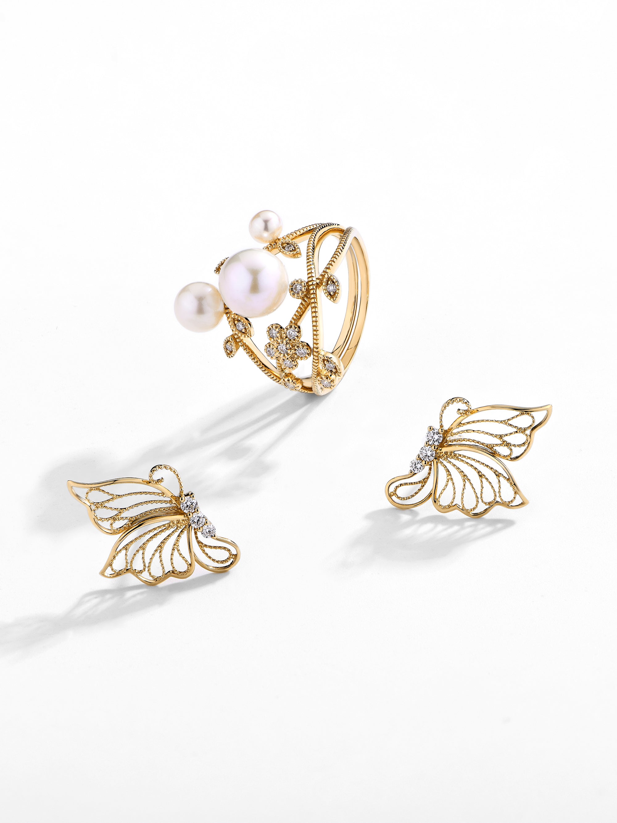 Upgrade your jewelry collection with atta butterfly flower set. Made with 18K gold with diamonds, this ring and earrings set includes stunning butterfly earrings and a beautiful flower-shaped ring. With the perfect combination of elegance and style, this set is sure to elevate any outfit.