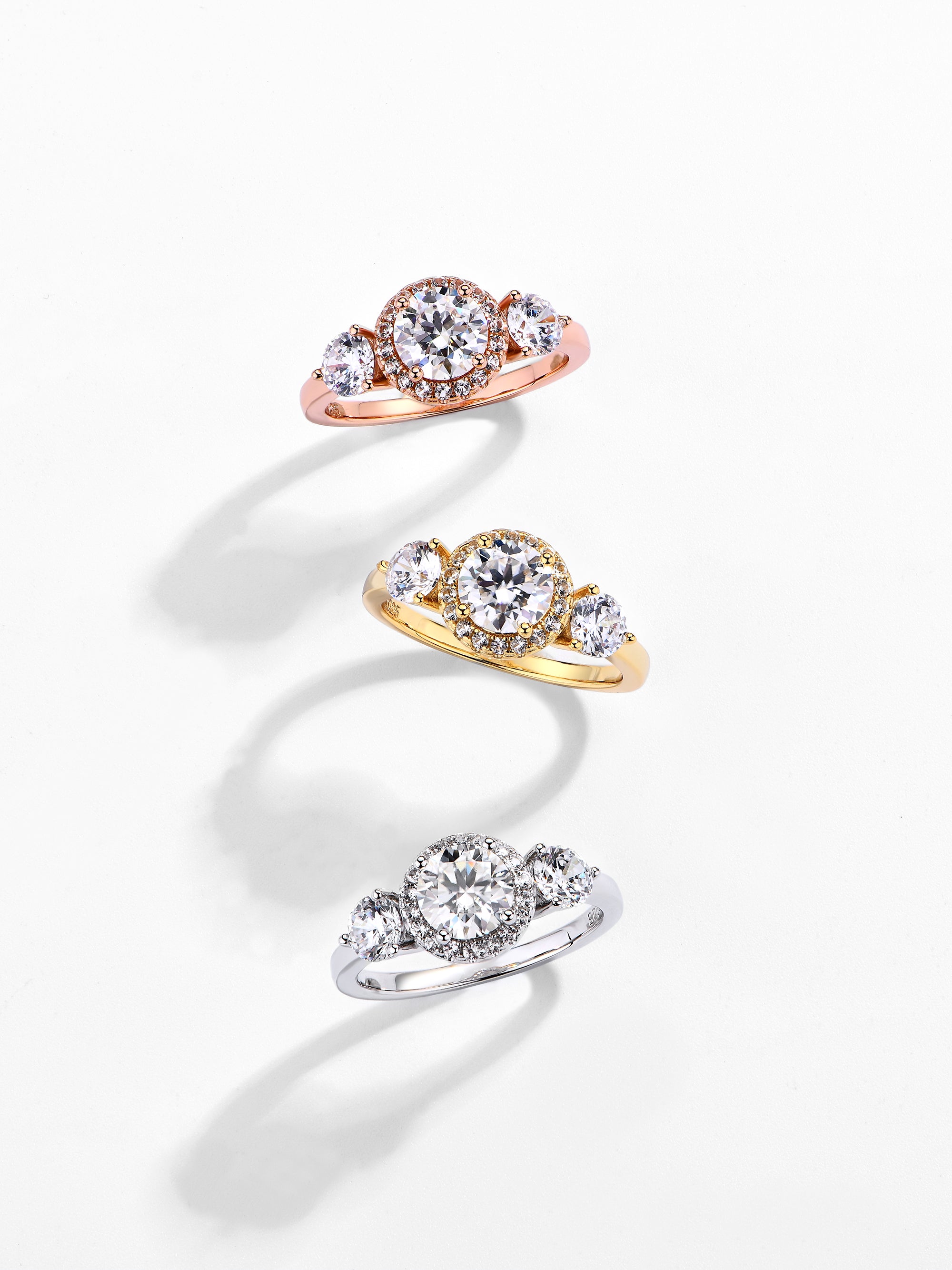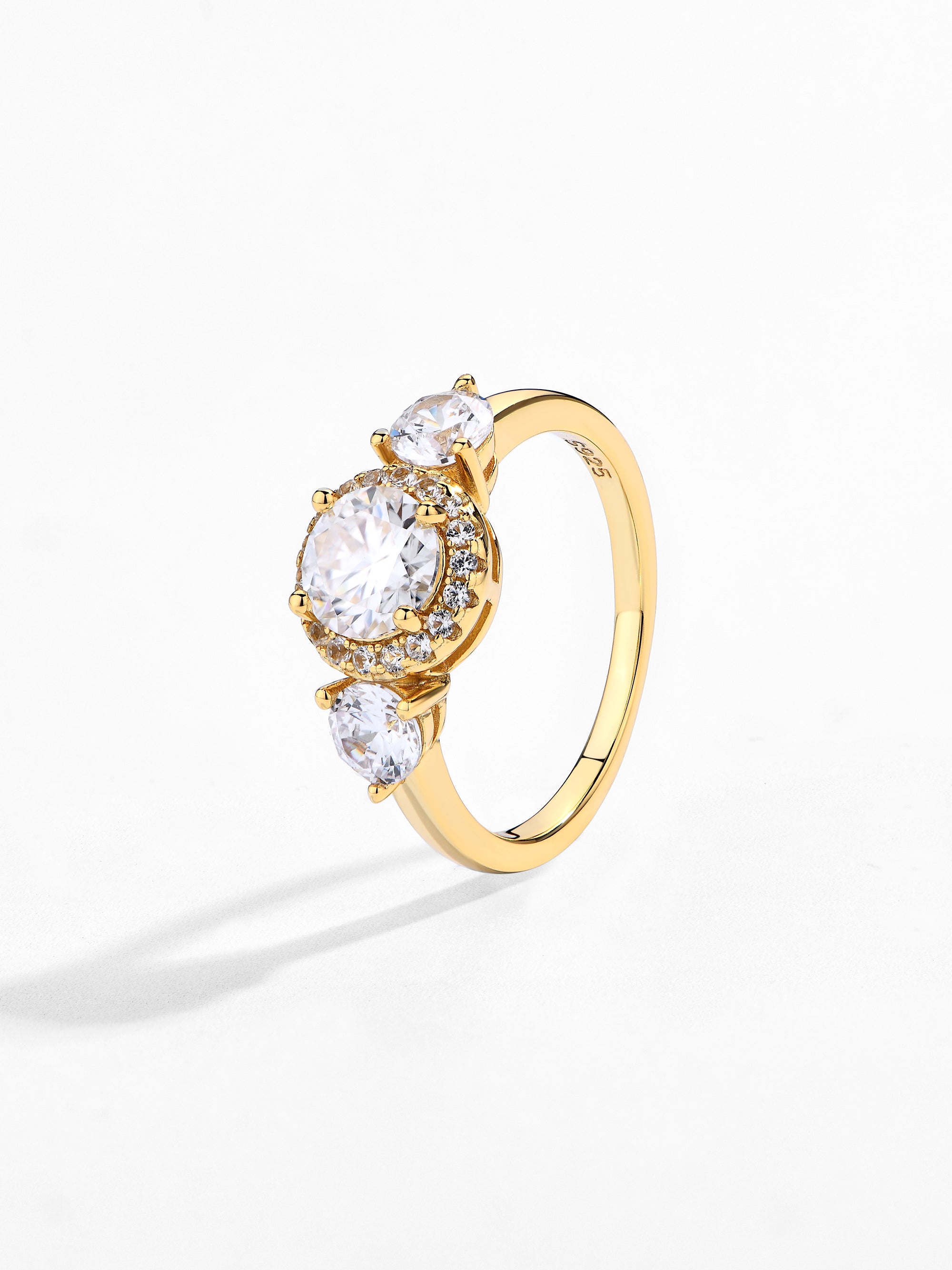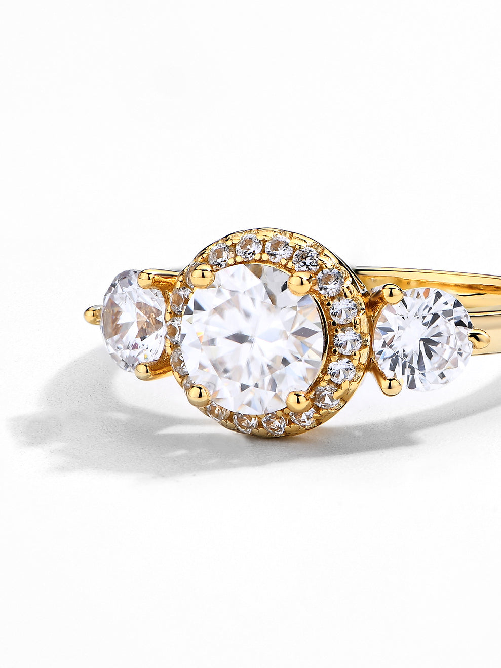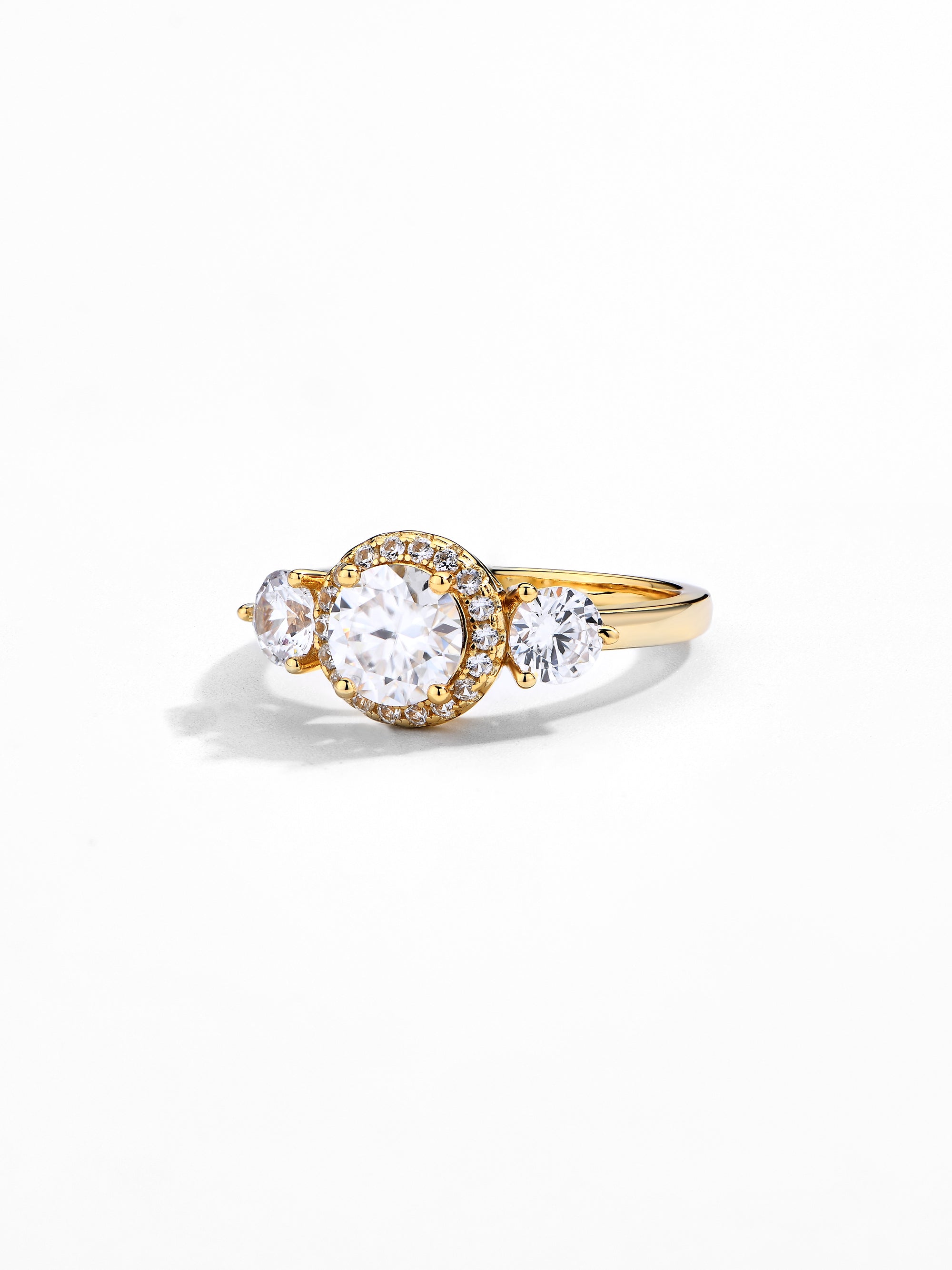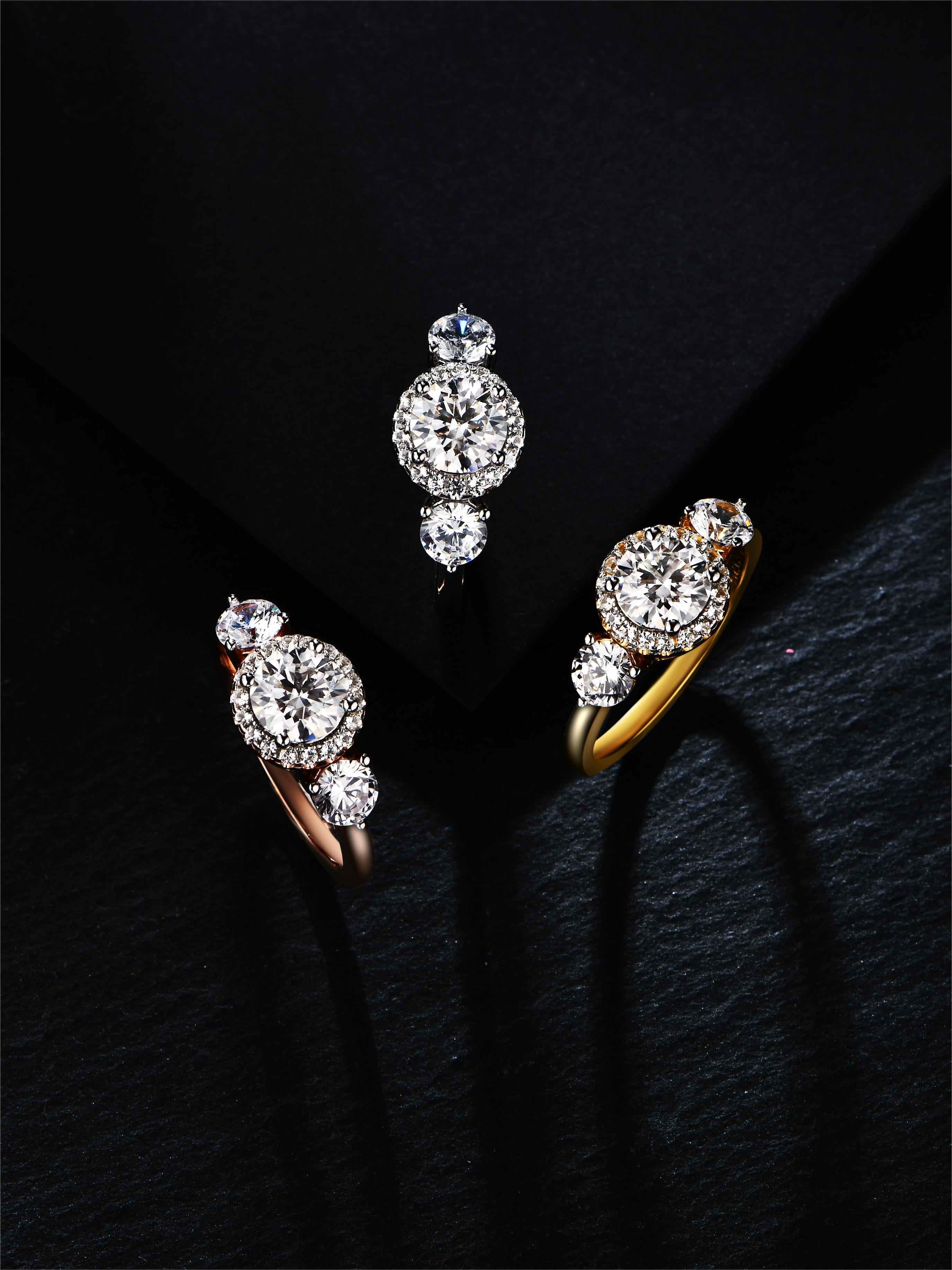 Find classic elegance in atta three stone engagement moissanite ring.This timeless design boasts three sparkling moissanite diamonds, symbolizing past, present, and future. Make a lasting statement with this stunning symbol of love and commitment.#R027