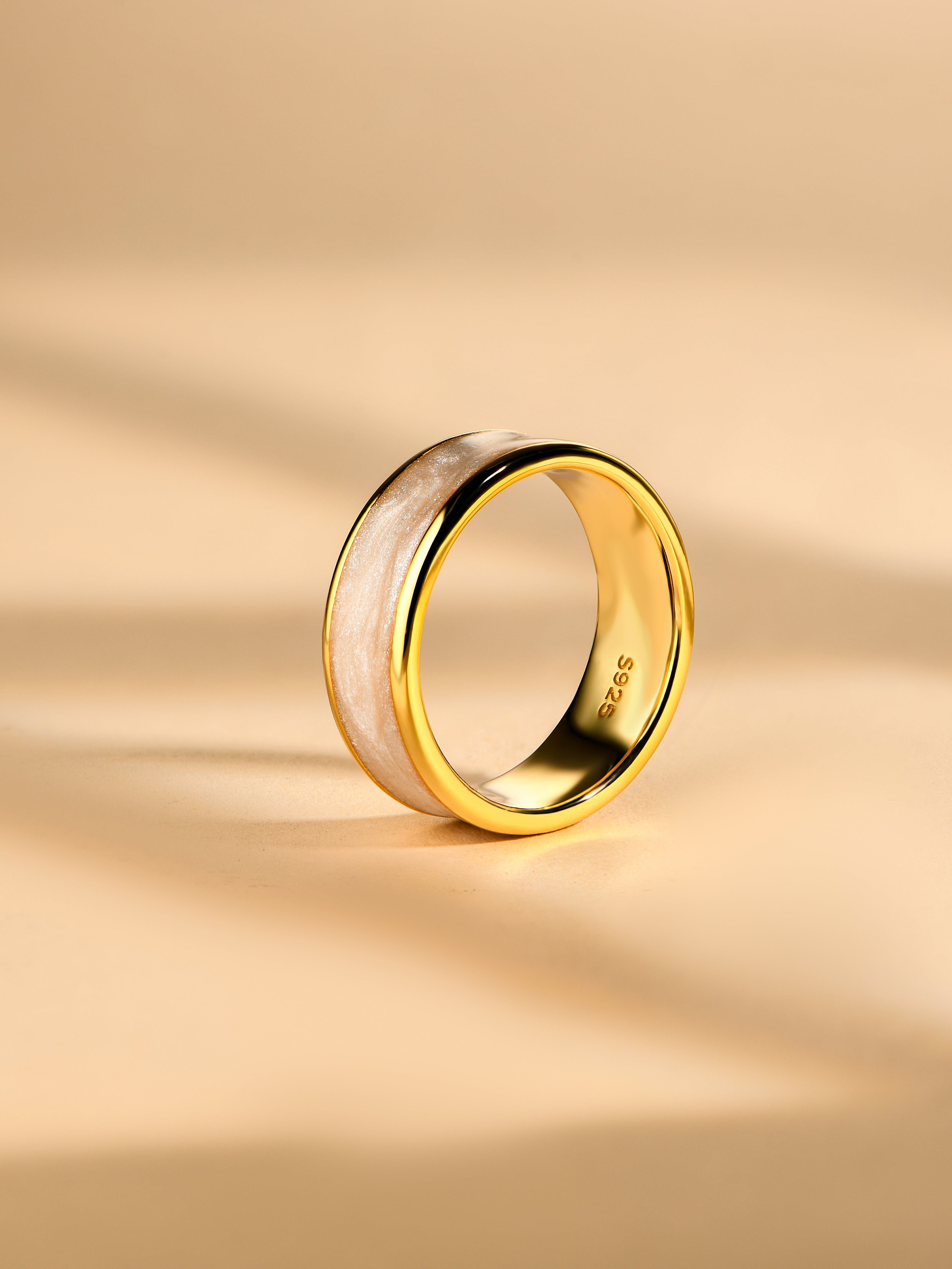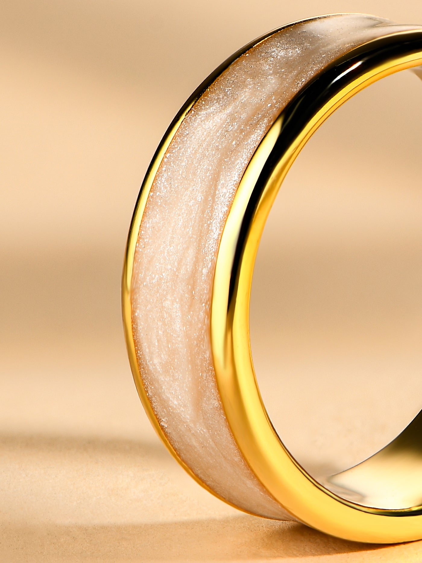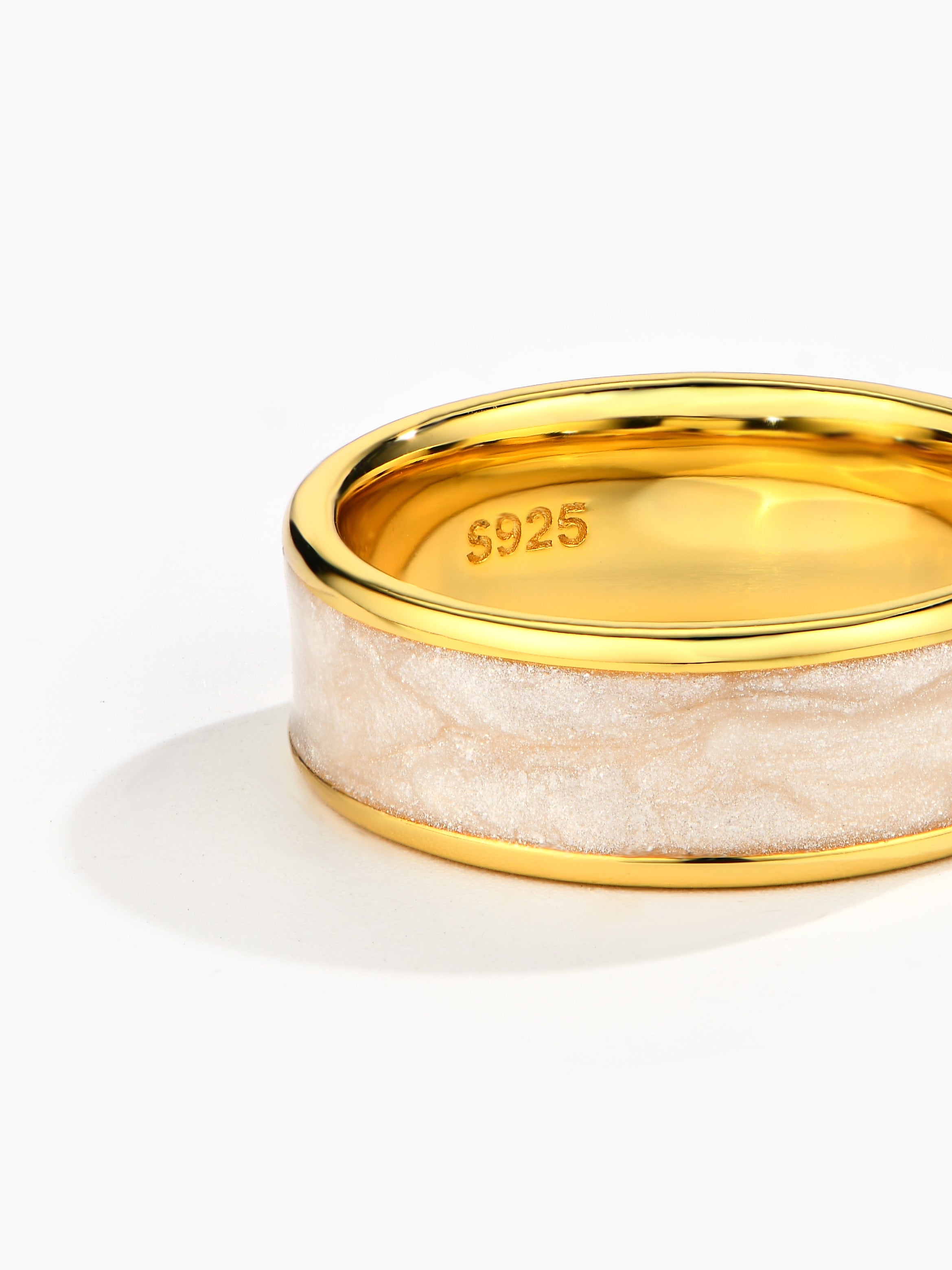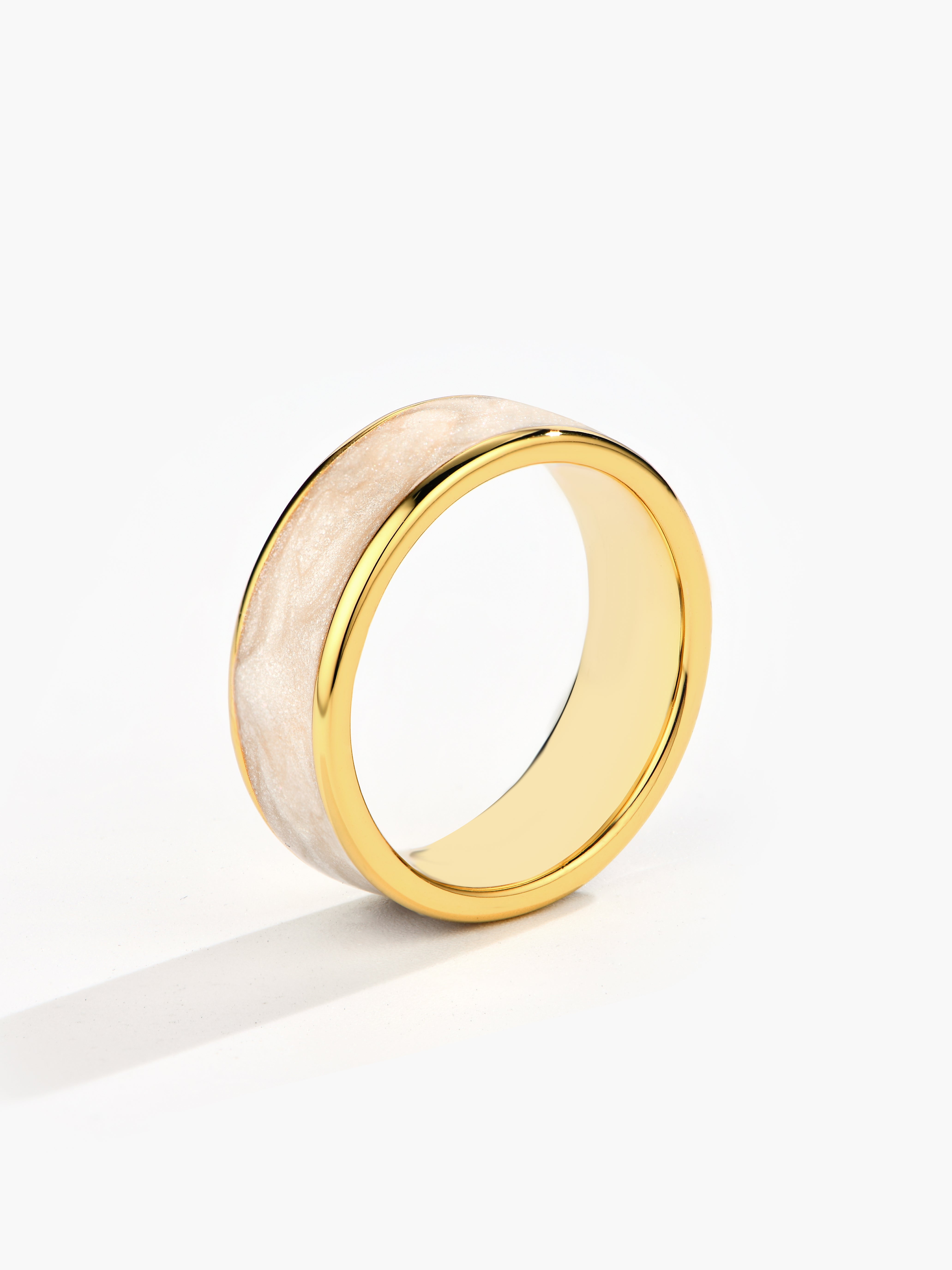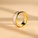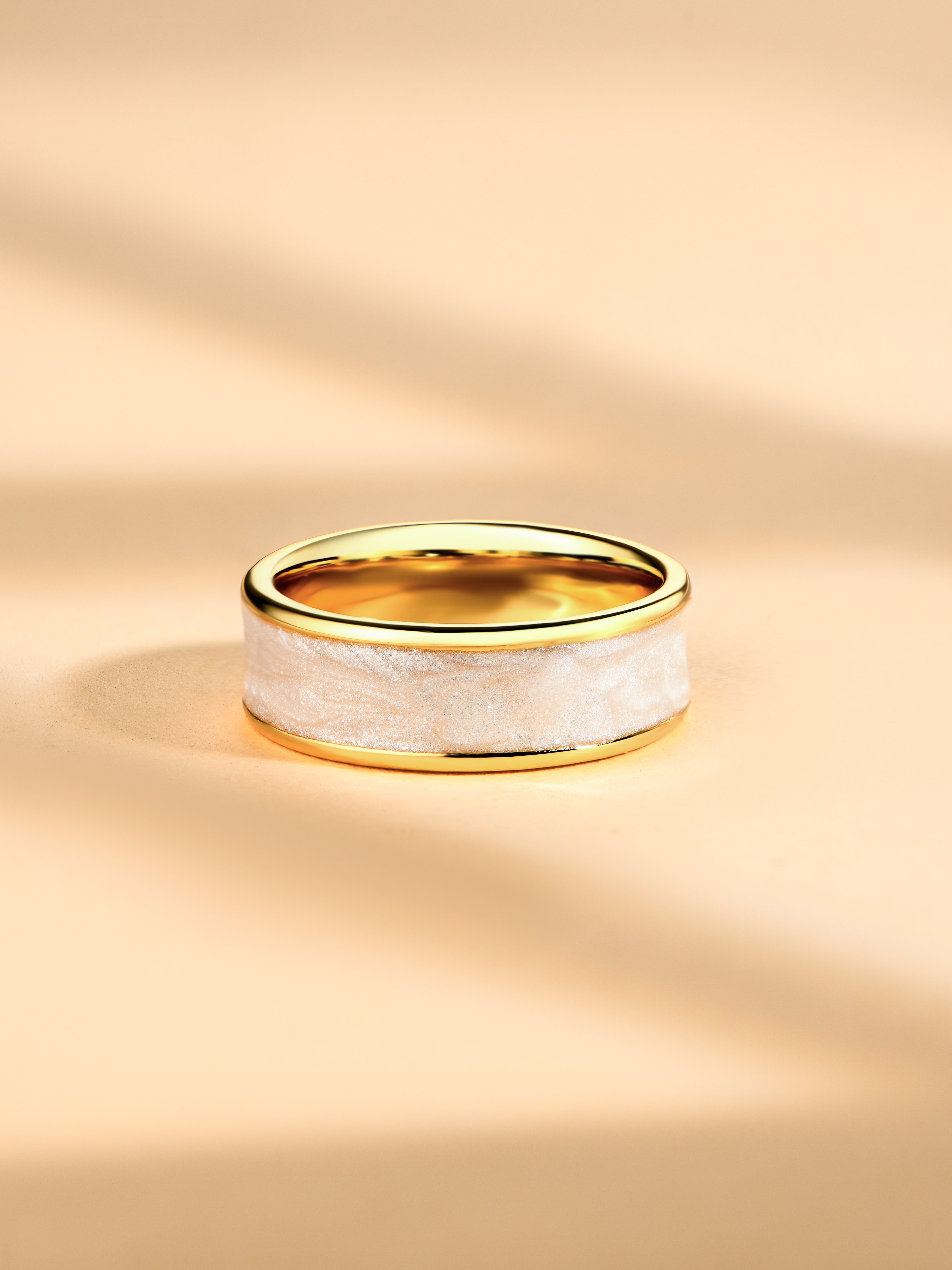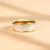This unique wedding ring features crushed pink and white elements, each polished to perfection. Handcrafted with care, this one-of-a-kind ring is sure to make a statement on your special day.