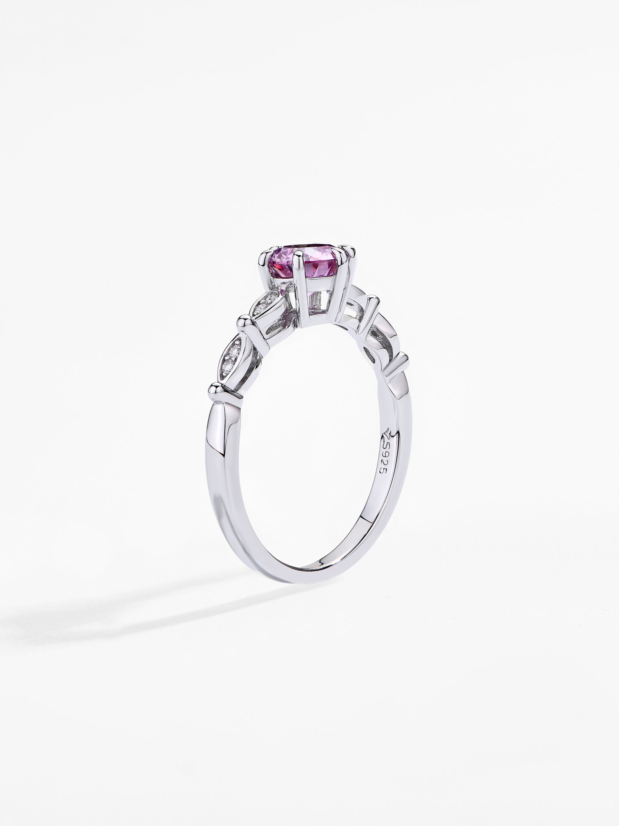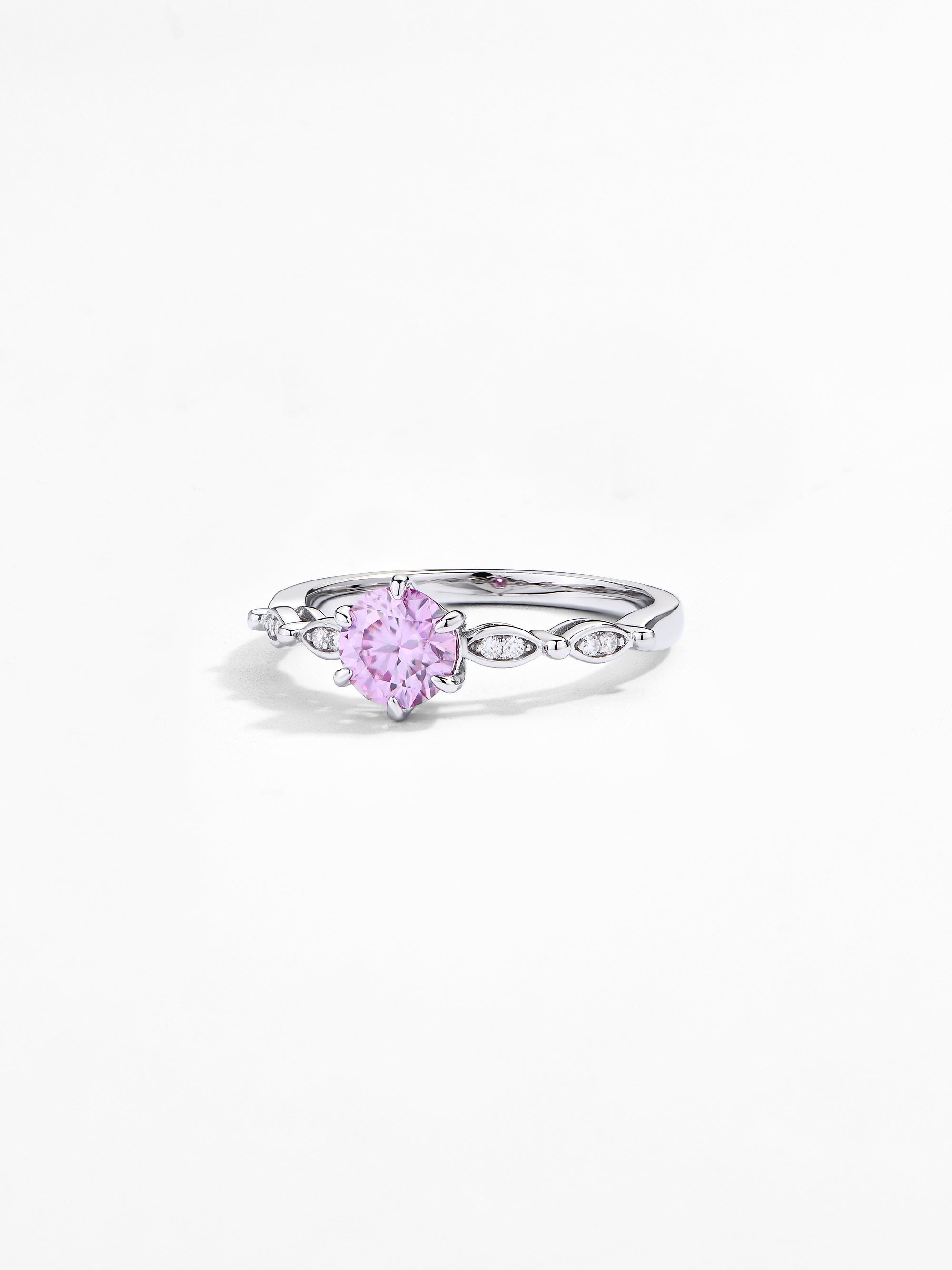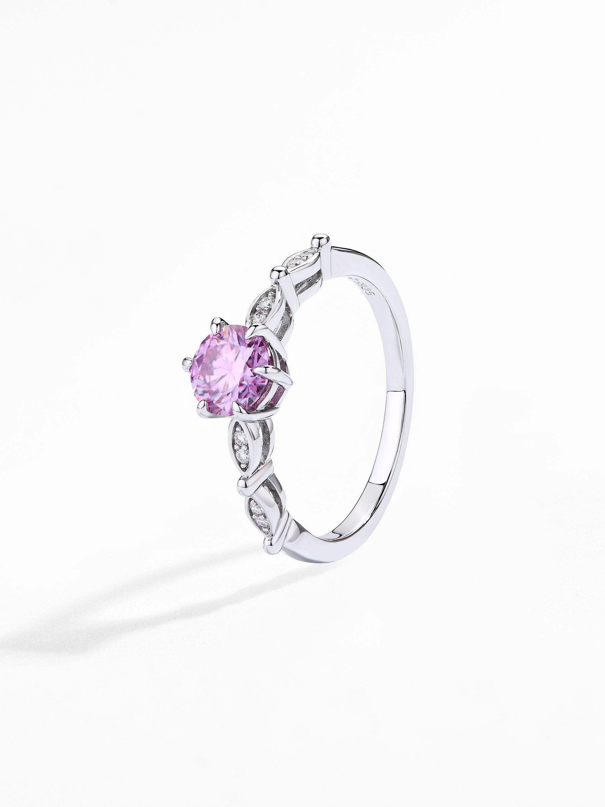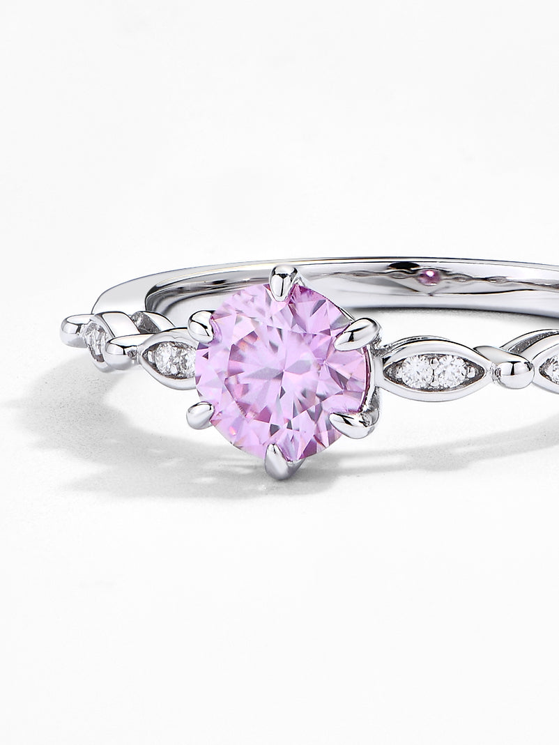 Craftsmanship & Design: Main stone pink moissanite round 1ct with side stone white moissanite. Each moissanite diamonds hand-selected and micro-pavé set by master artisans.