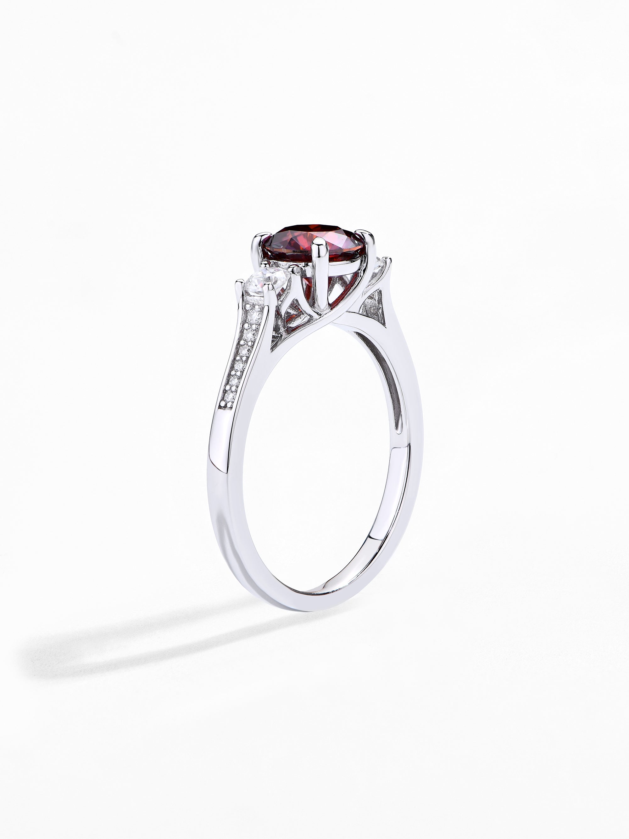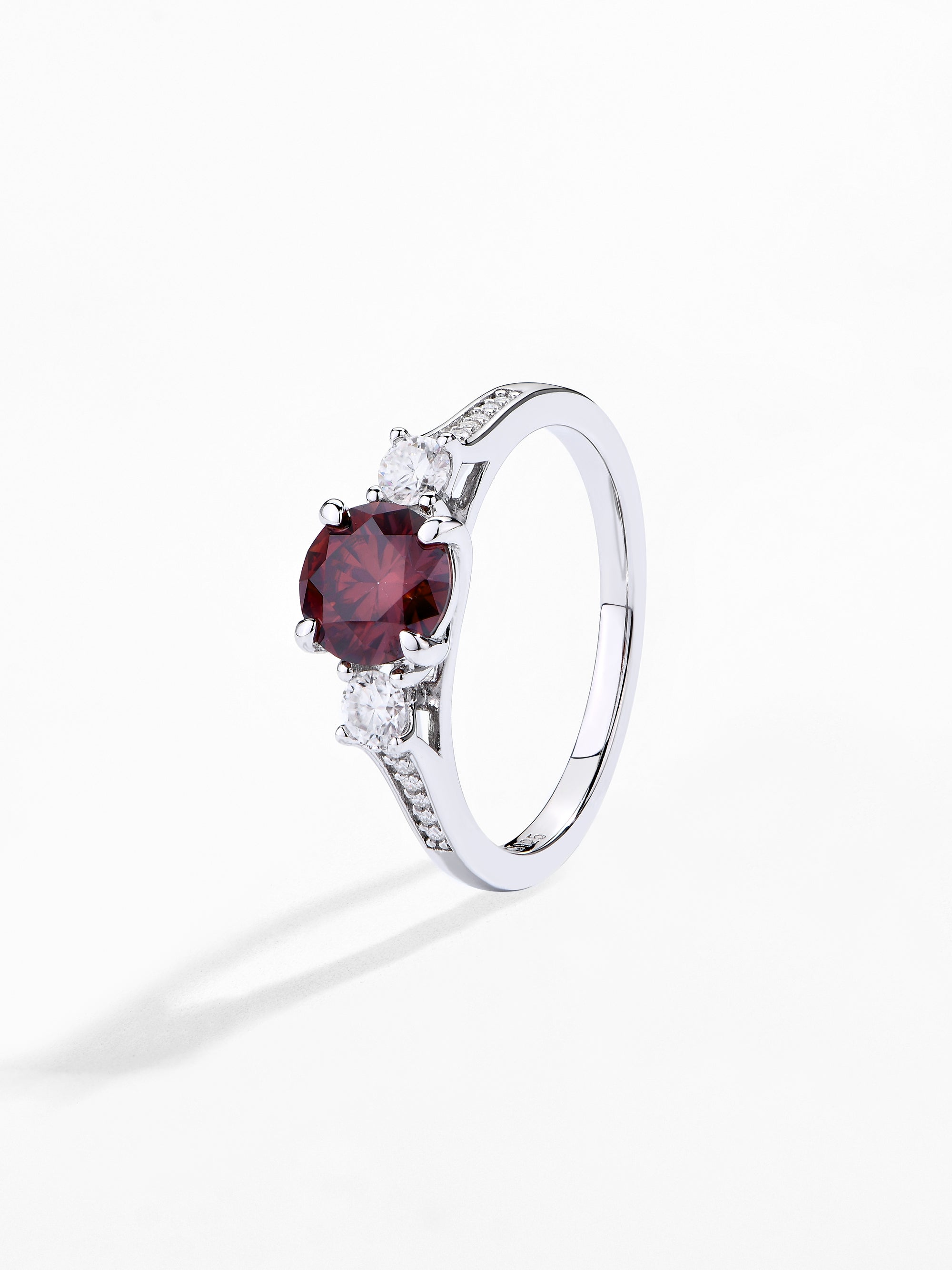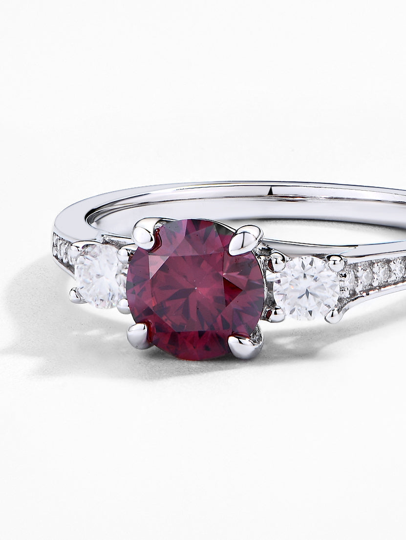Craftsmanship & Design: Main stone red moissanite round 1ct with side stone white moissanite. Each moissanite diamonds hand-selected and micro-pavé set by master artisans.
