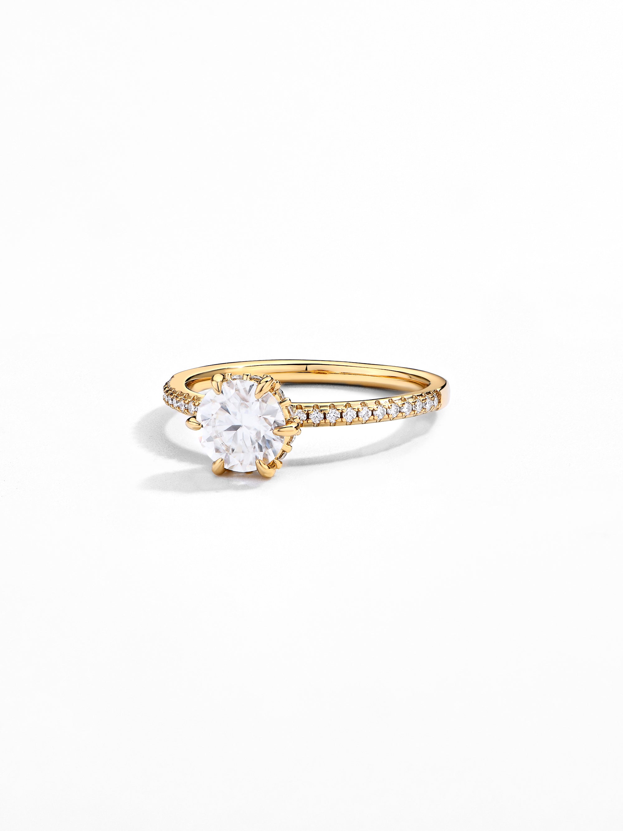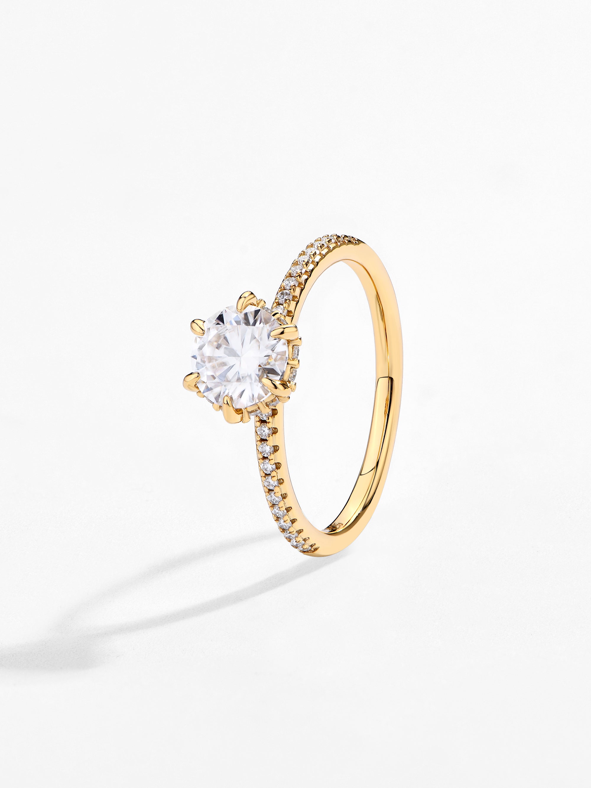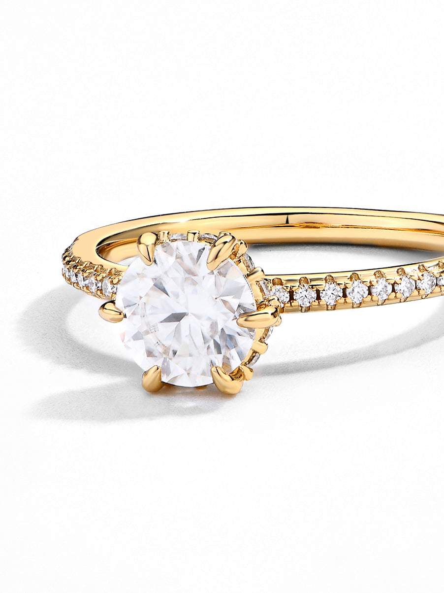 Craftsmanship & Design: Main stone round  6.5mm 1ct and 1.0-1.2mm round with full moissanite diamonds. Each moissanite stone hand-selected and micro-pavé set by master artisans.
