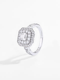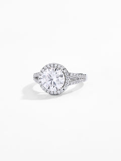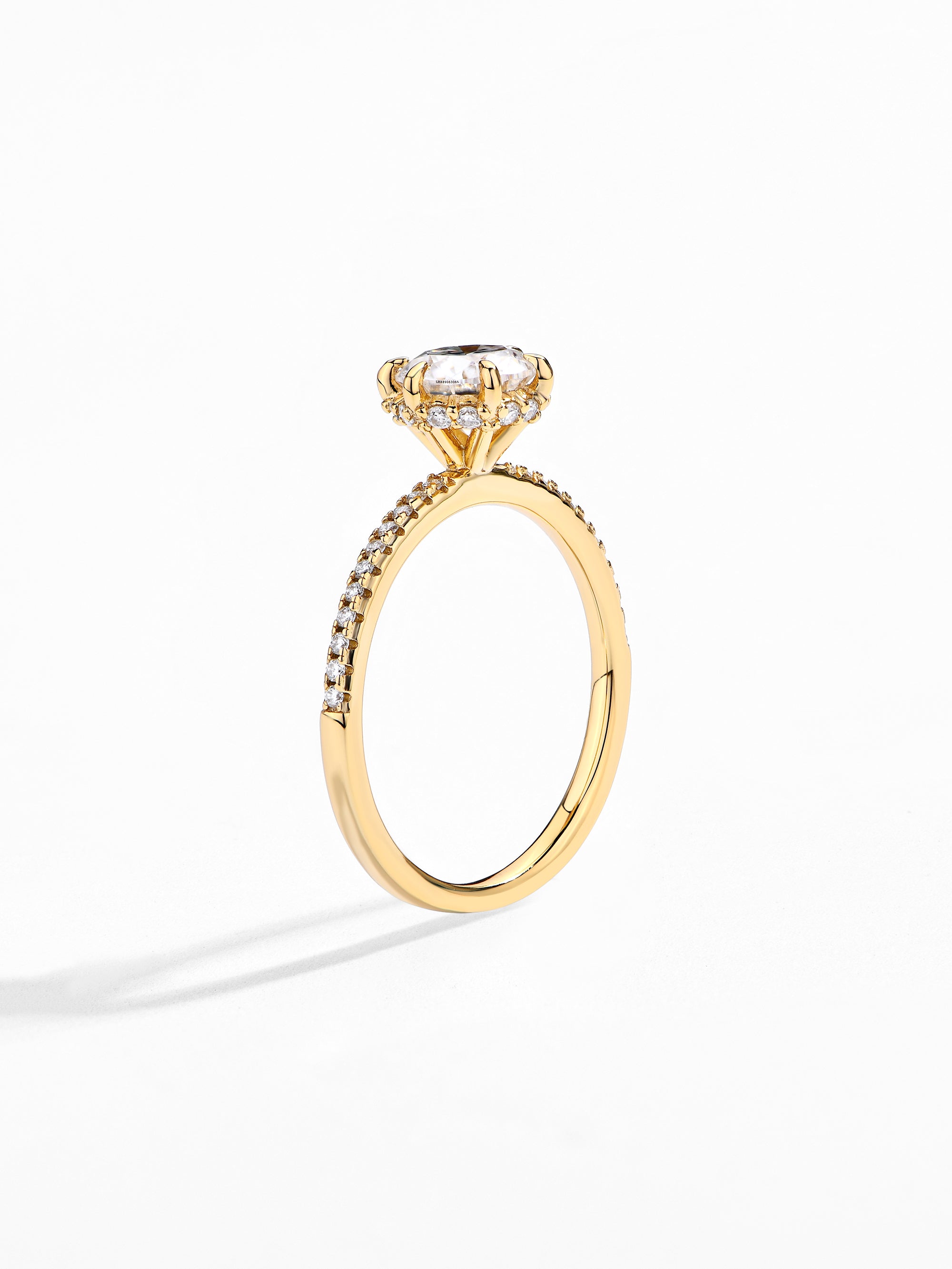 1ct six prong hidden halo round moissanite engagement ring will take your breath away. With its unique hidden halo design, this ring adds a touch of mystery and charm to any engagement. #R045