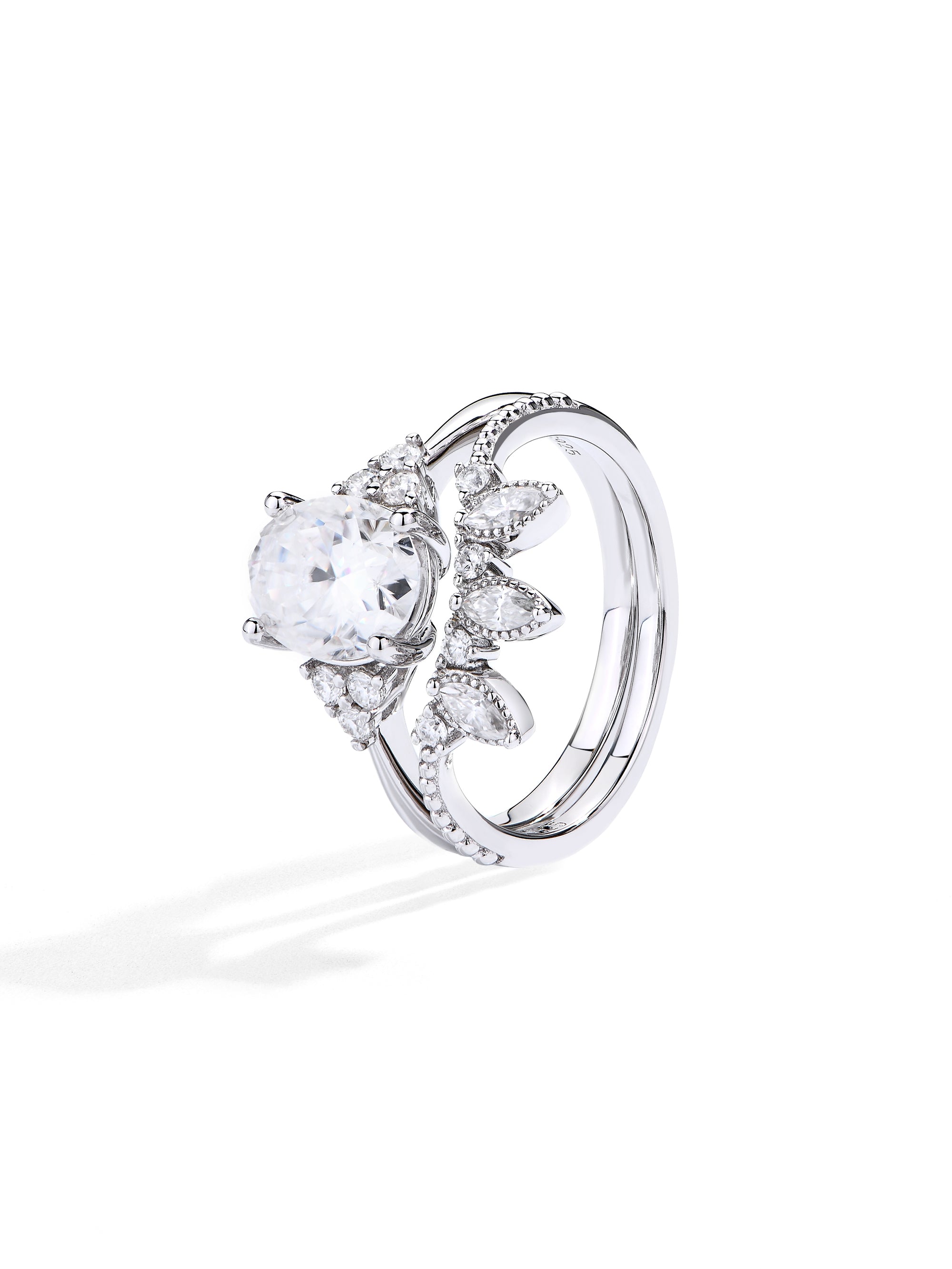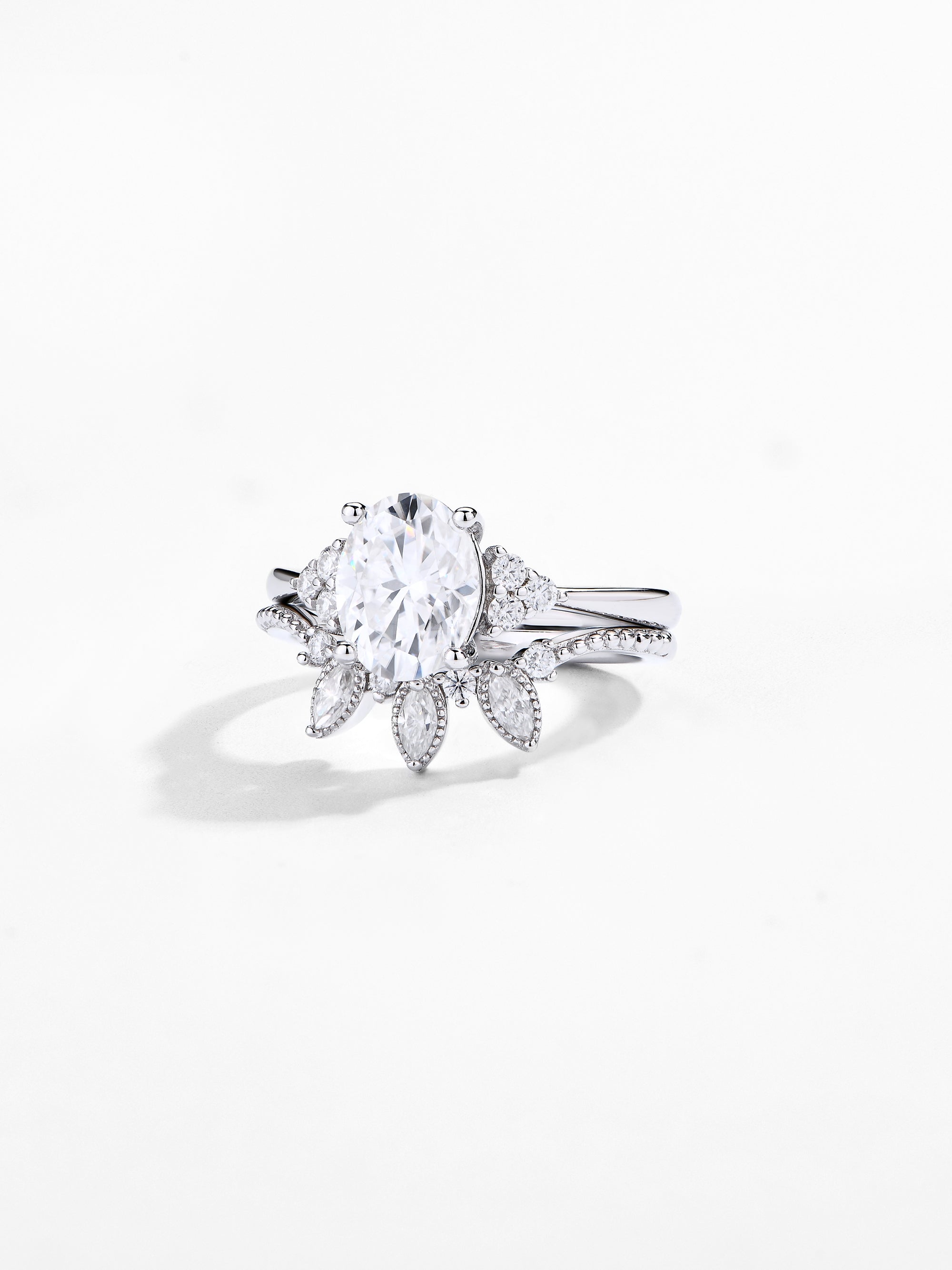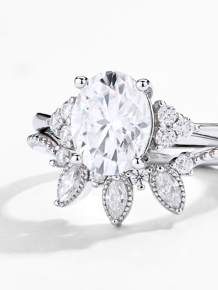 Craftsmanship & Design: Main stone moissanite oval 9*7mm 2ct and side stone round and marquise cut with full moissanite. Each moissanite diamonds hand-selected and micro-pavé set by master artisans.