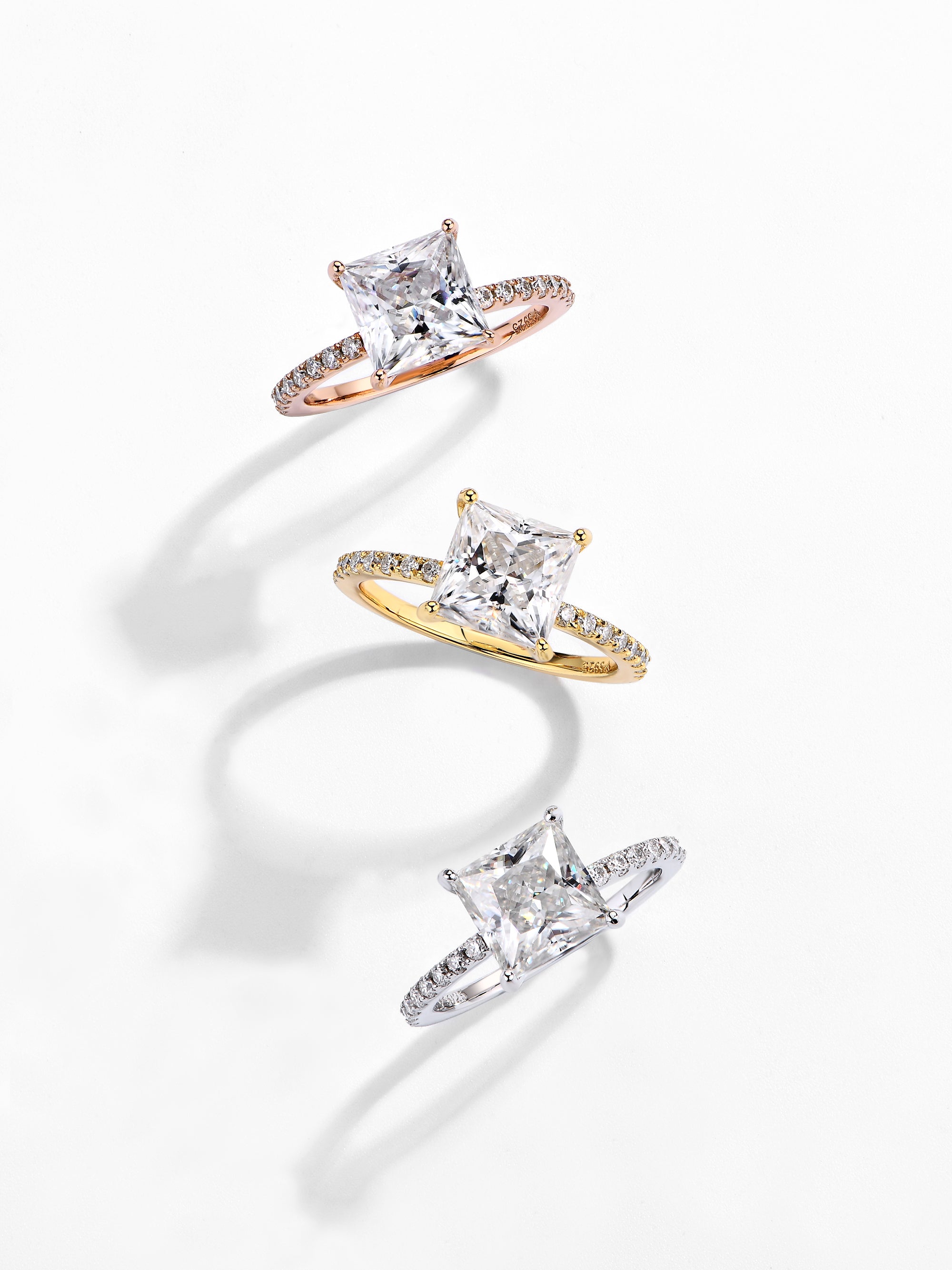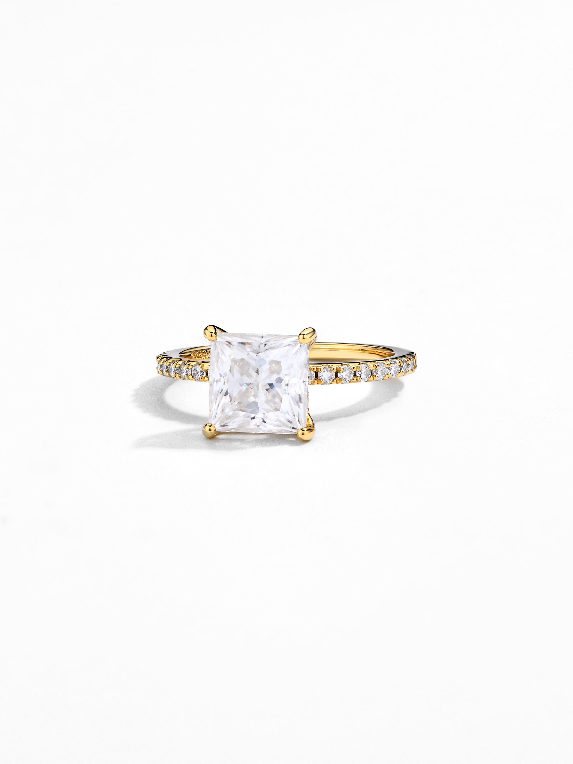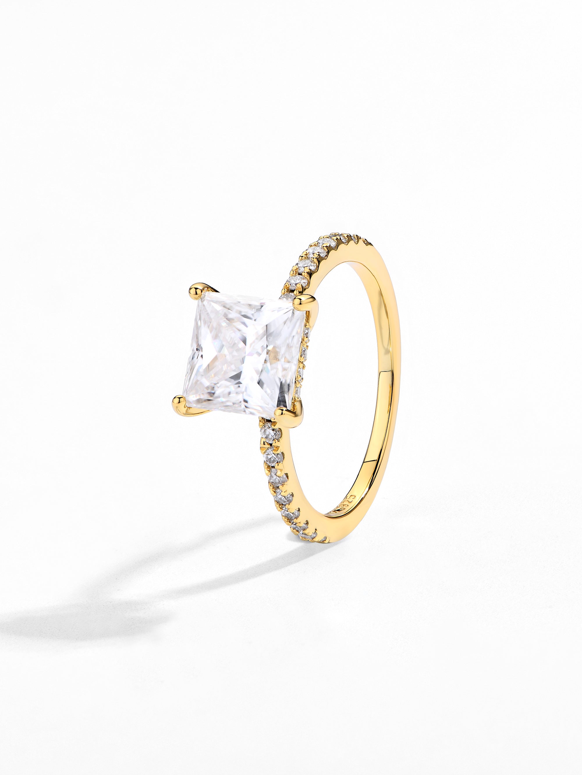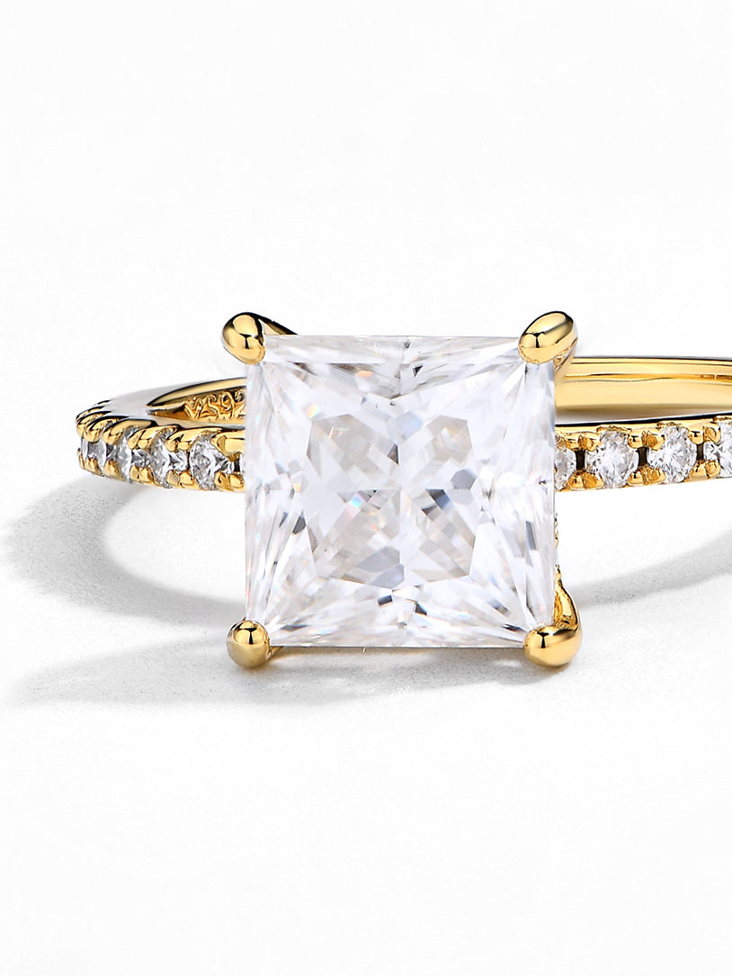 Craftsmanship & Design: Main stone princess cut 8*8mm 3ct and side stone 1.2-1.3mm with full moissanite. Each moissanite diamond hand-selected and micro-pavé set by master artisans.