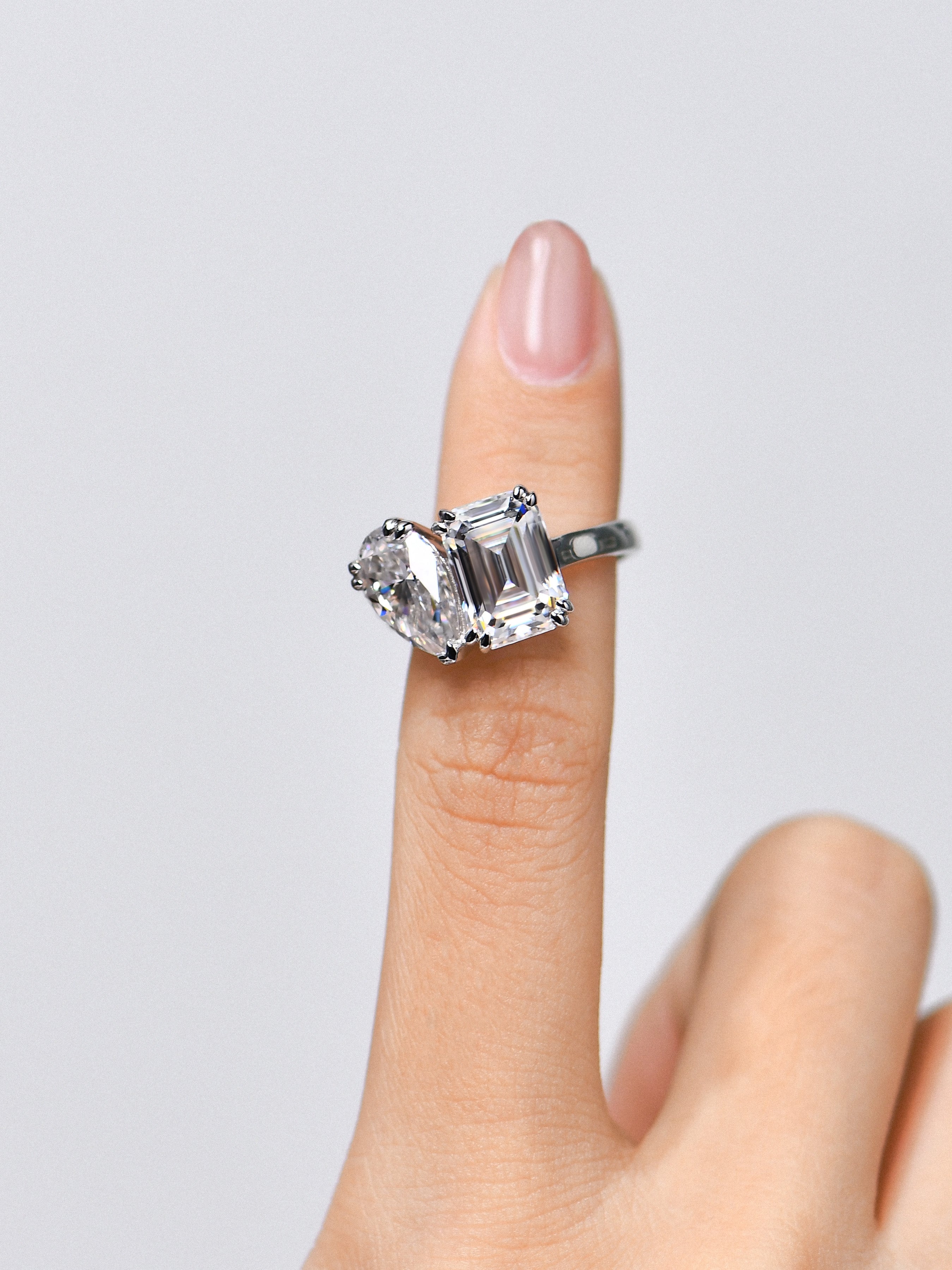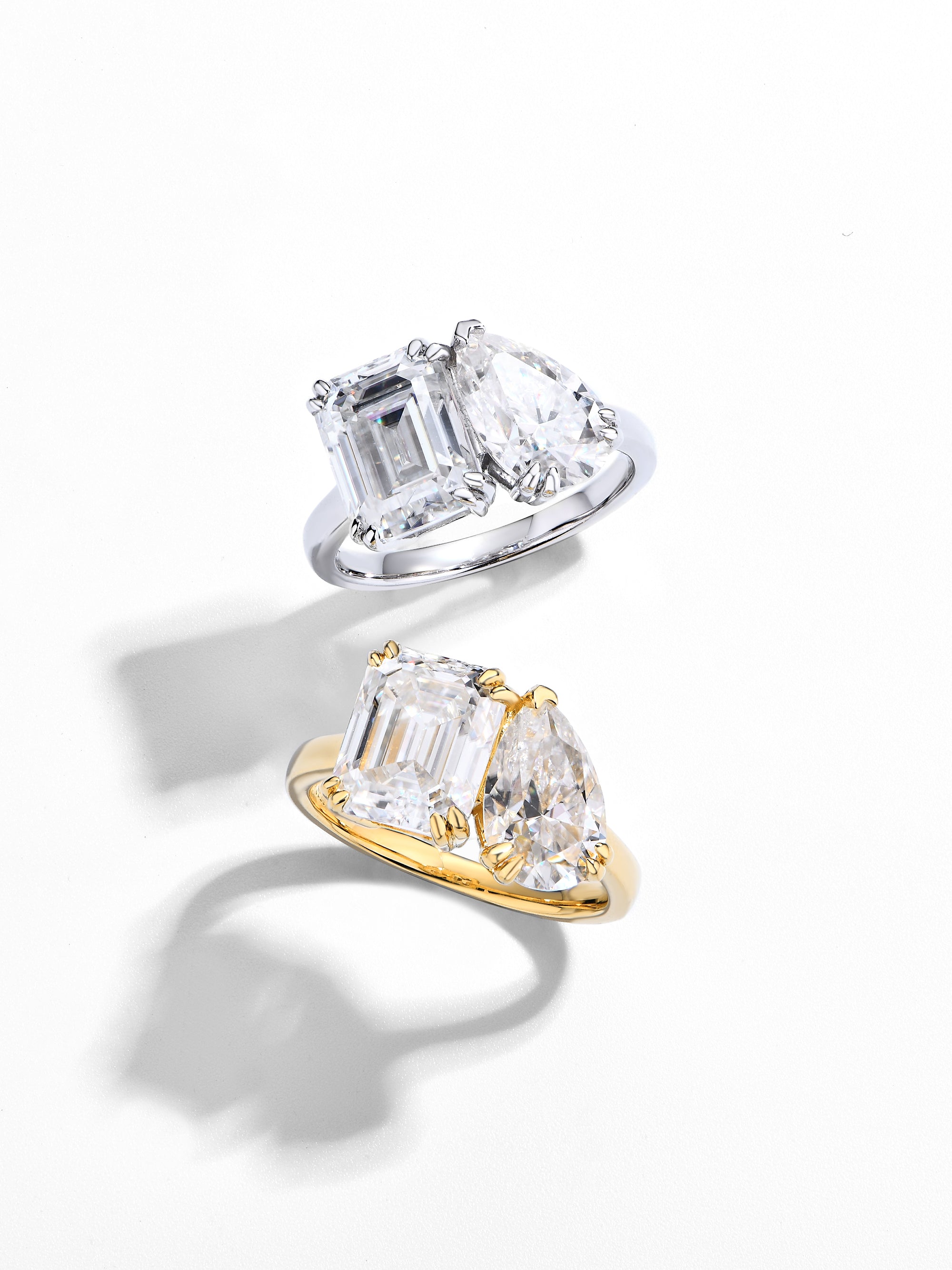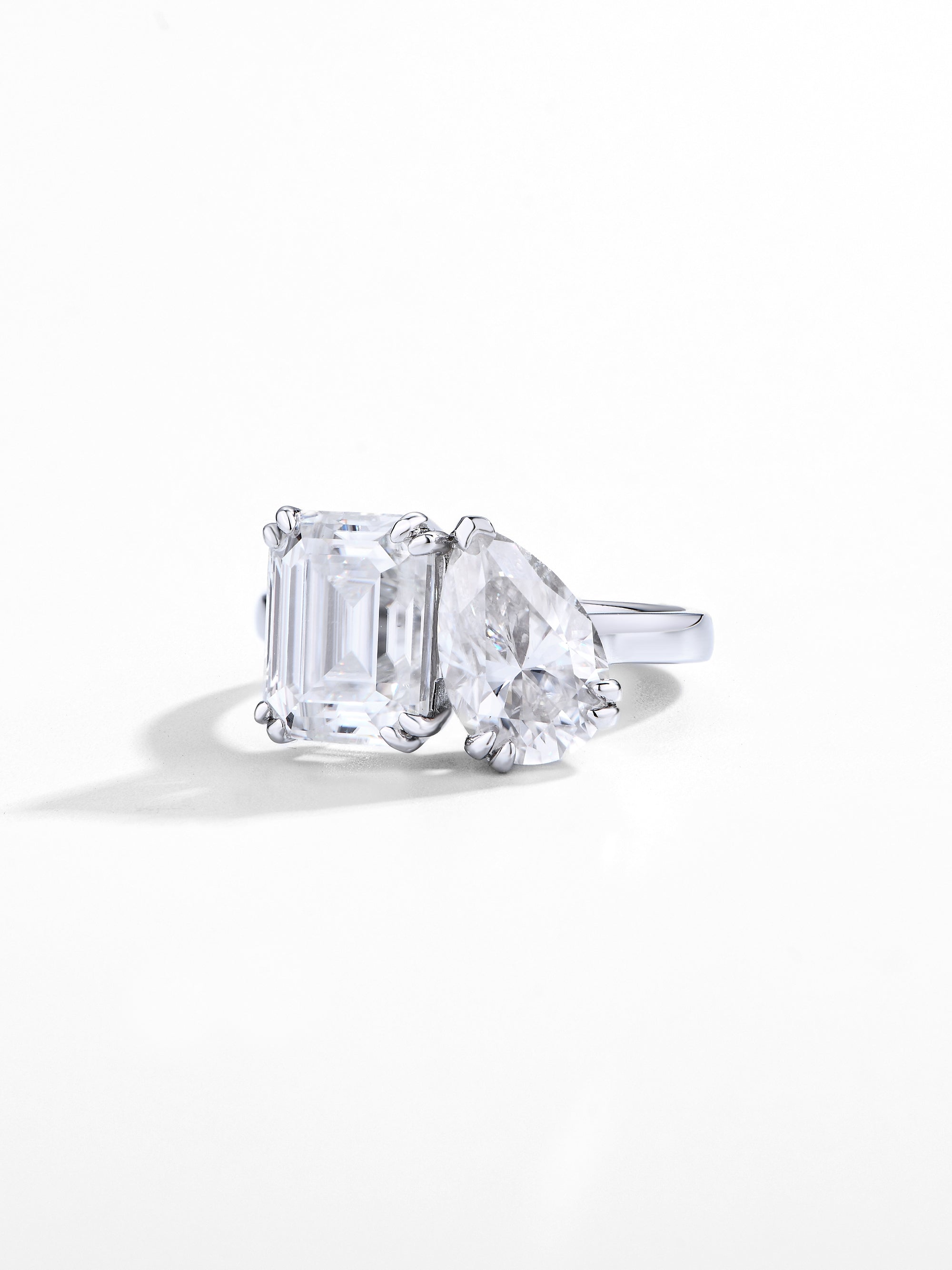 Craftsmanship & Design: Toi-et Moi design. Main stone pear 11*7mm(3ct)and emerald 10*8mm(4ct)with full moissanite, total 7ct. Each stone hand-selected and micro-pavé set by master artisans.