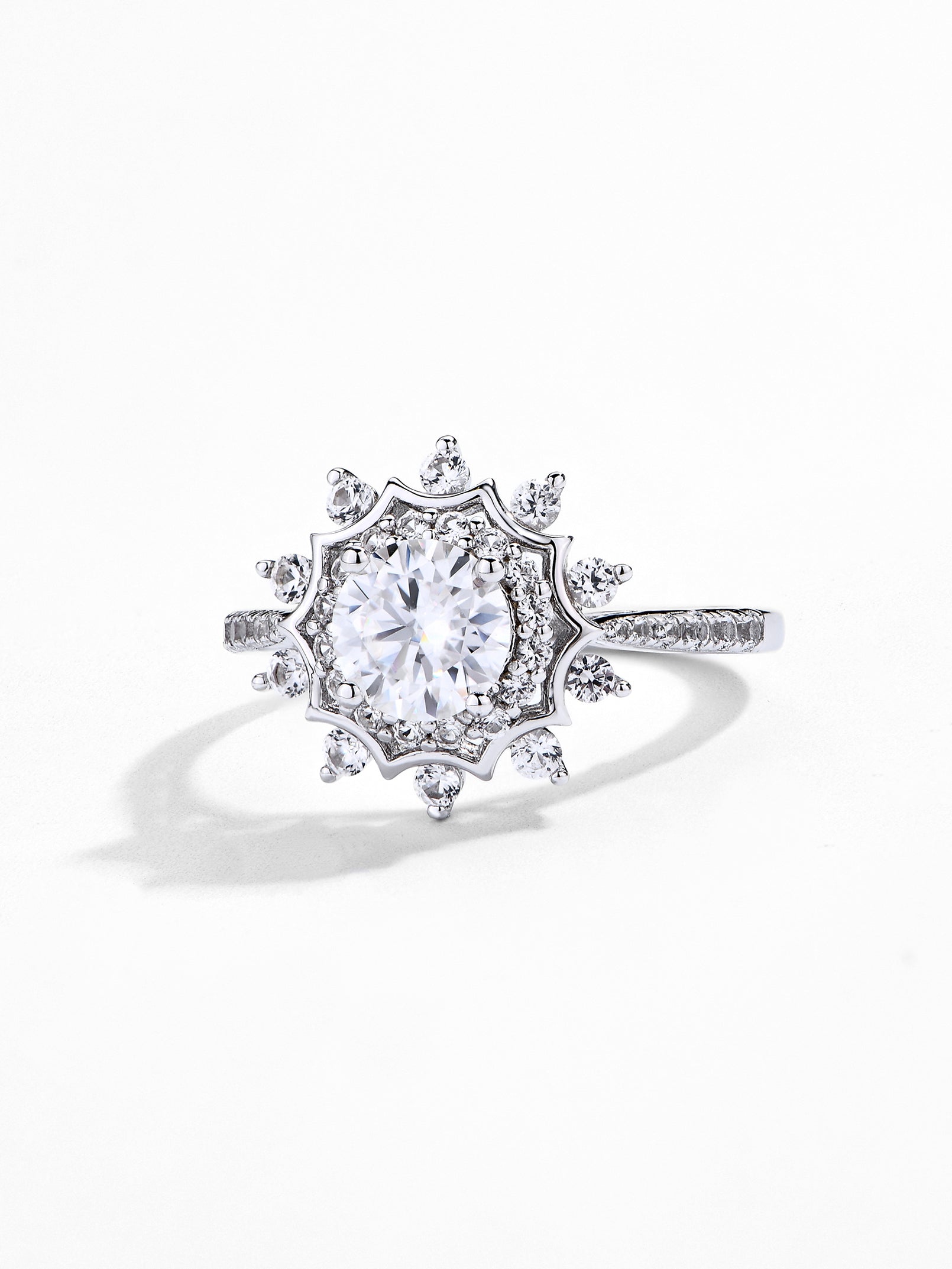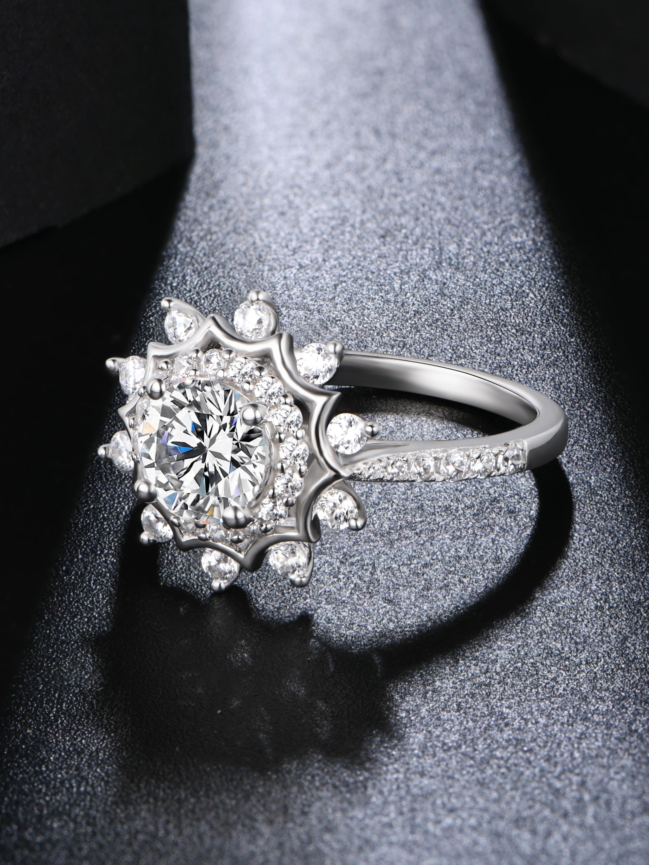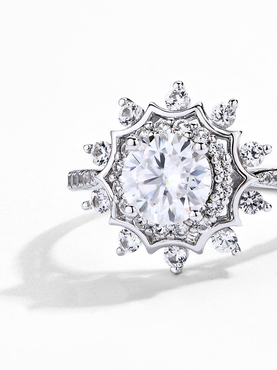 Looking for a ring as unique as your love? This fancy halo round moissanite diamond engagement ring features a stunning moissanite diamond surrounded by a halo of sparkle.#R017
