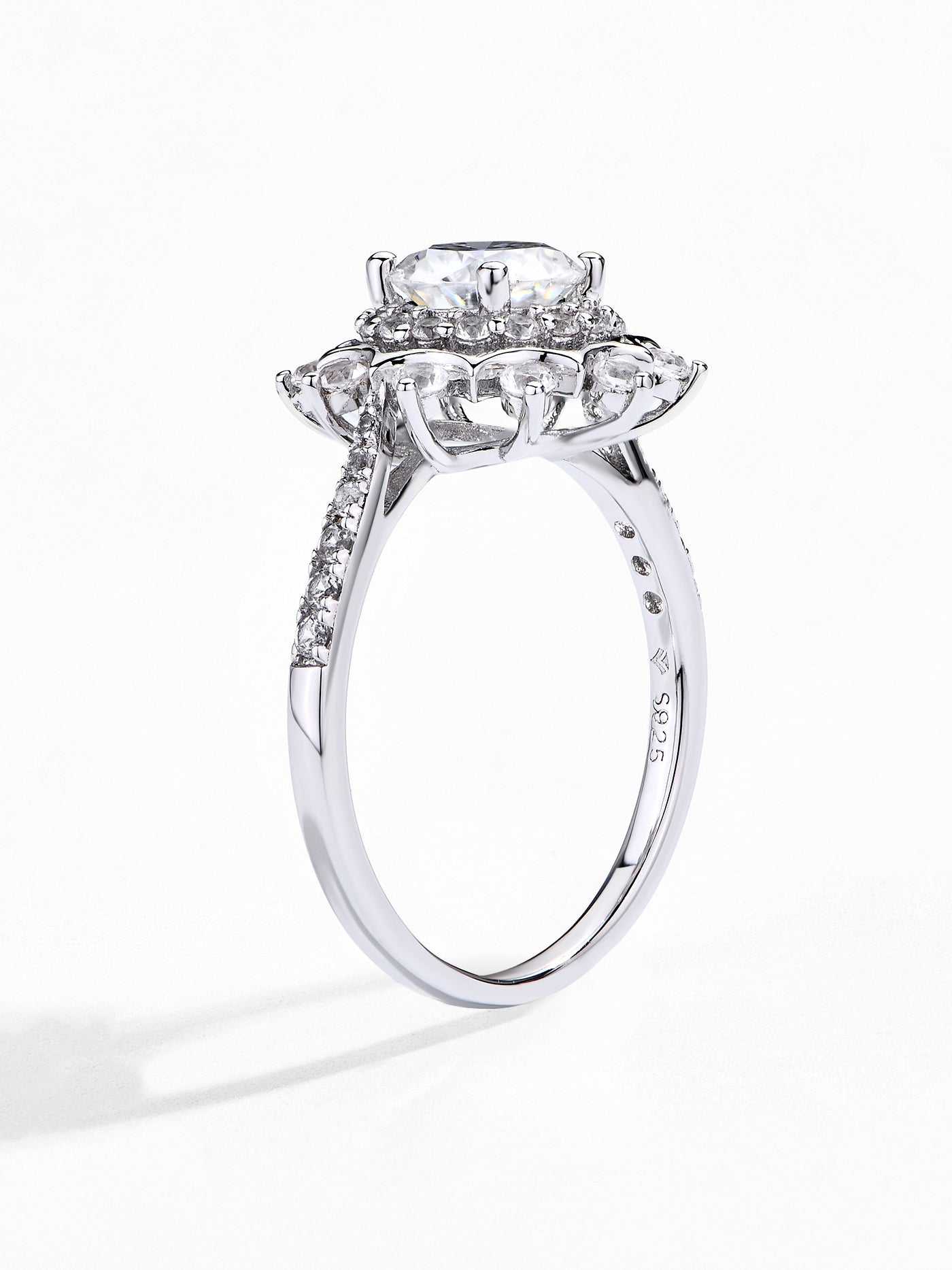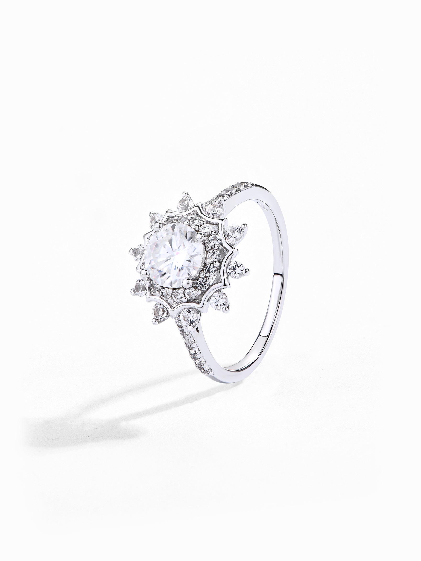 Craftsmanship & Design: Main stone round cut 6.5mm and side stone 0.8-1.8mm with full moissanite diammonds. Each moissanite stone hand-selected and micro-pavé set by master artisans.