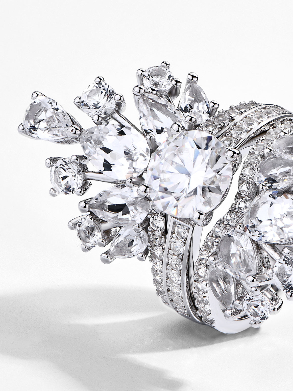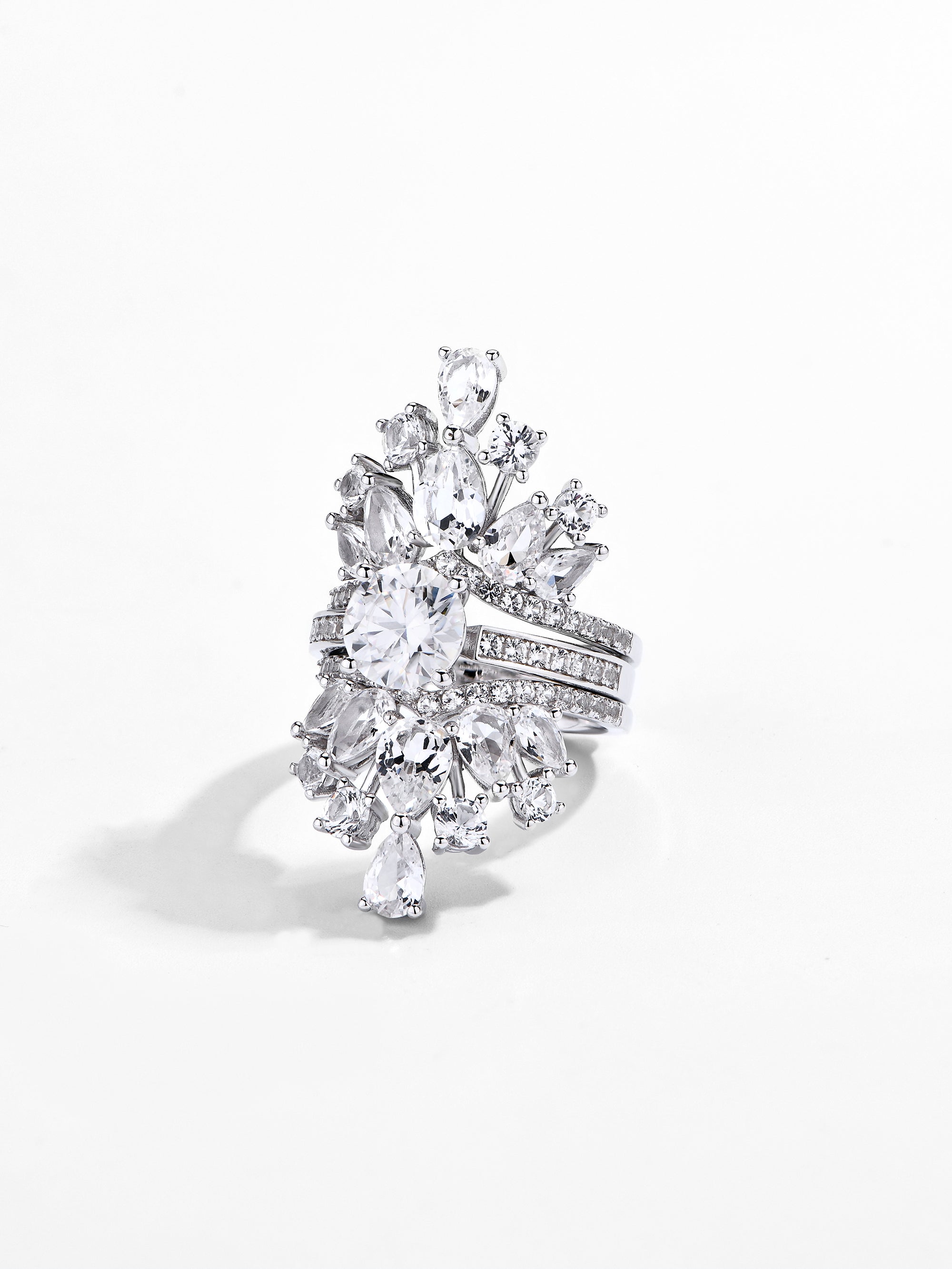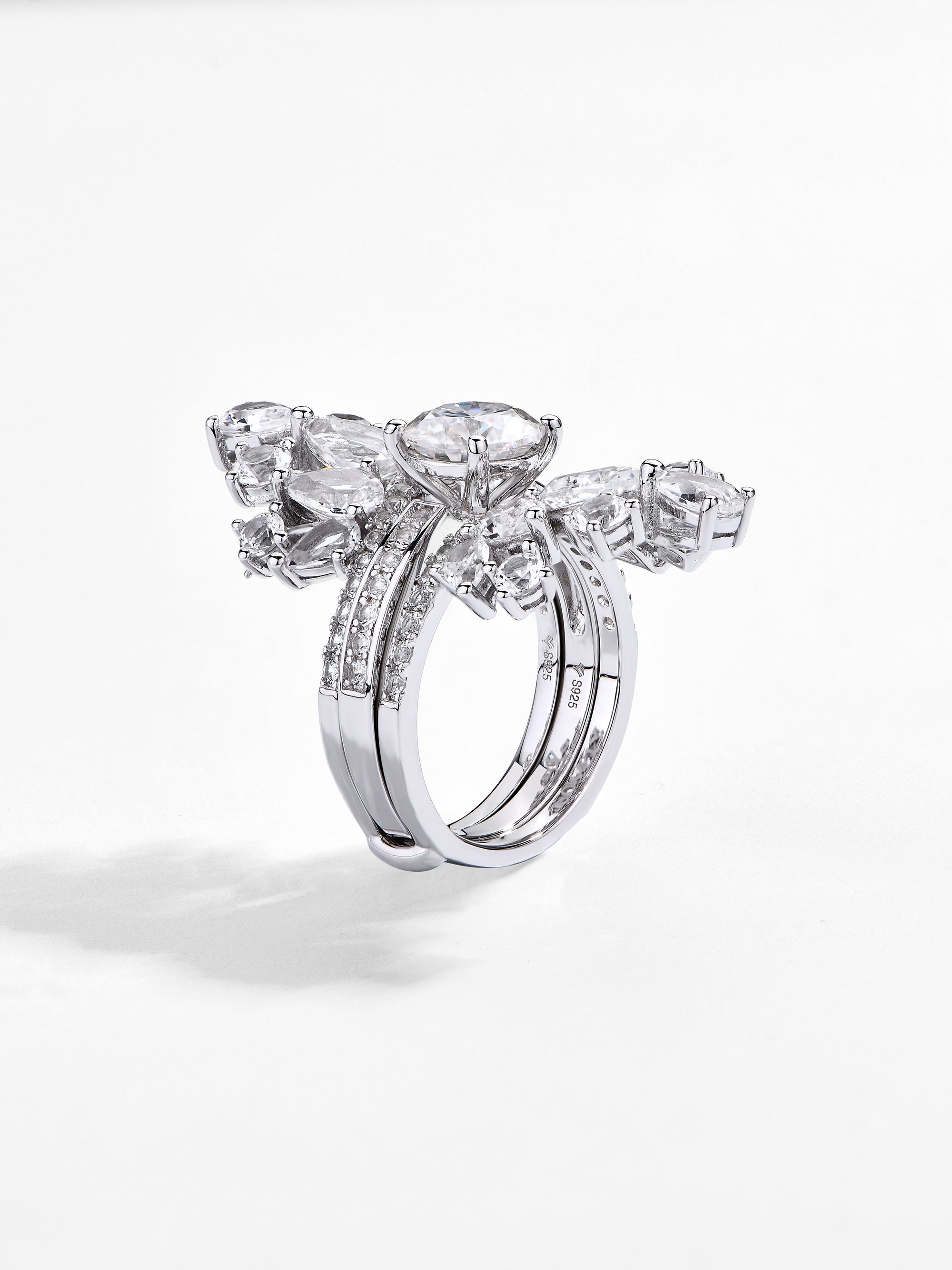 side stone of various shapes and sizes. Each moissanite stone hand-selected and micro-pavé set by master artisans.