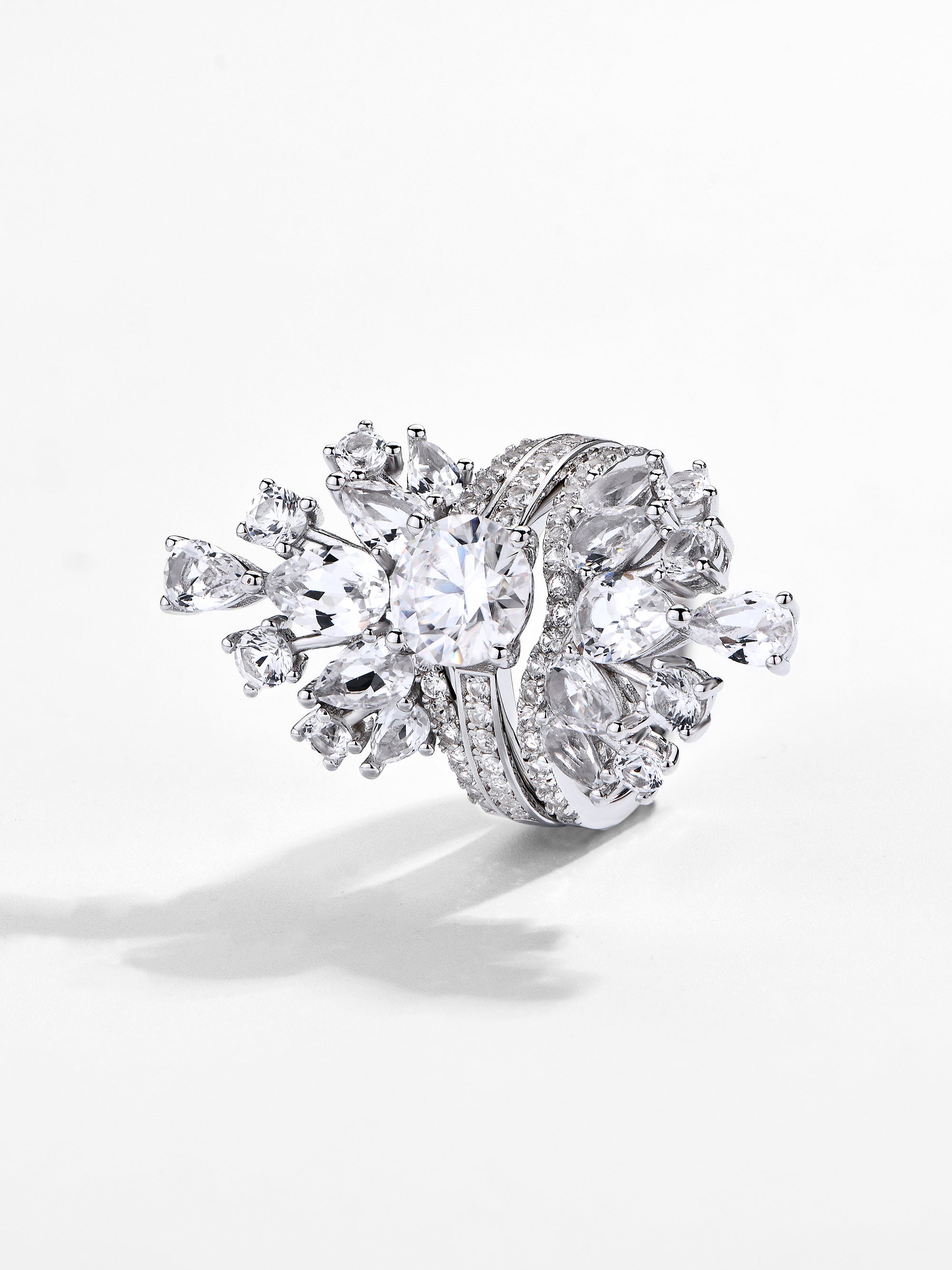 Craftsmanship & Design: Main stone round  moissanite 2.5ct and 73 pcs