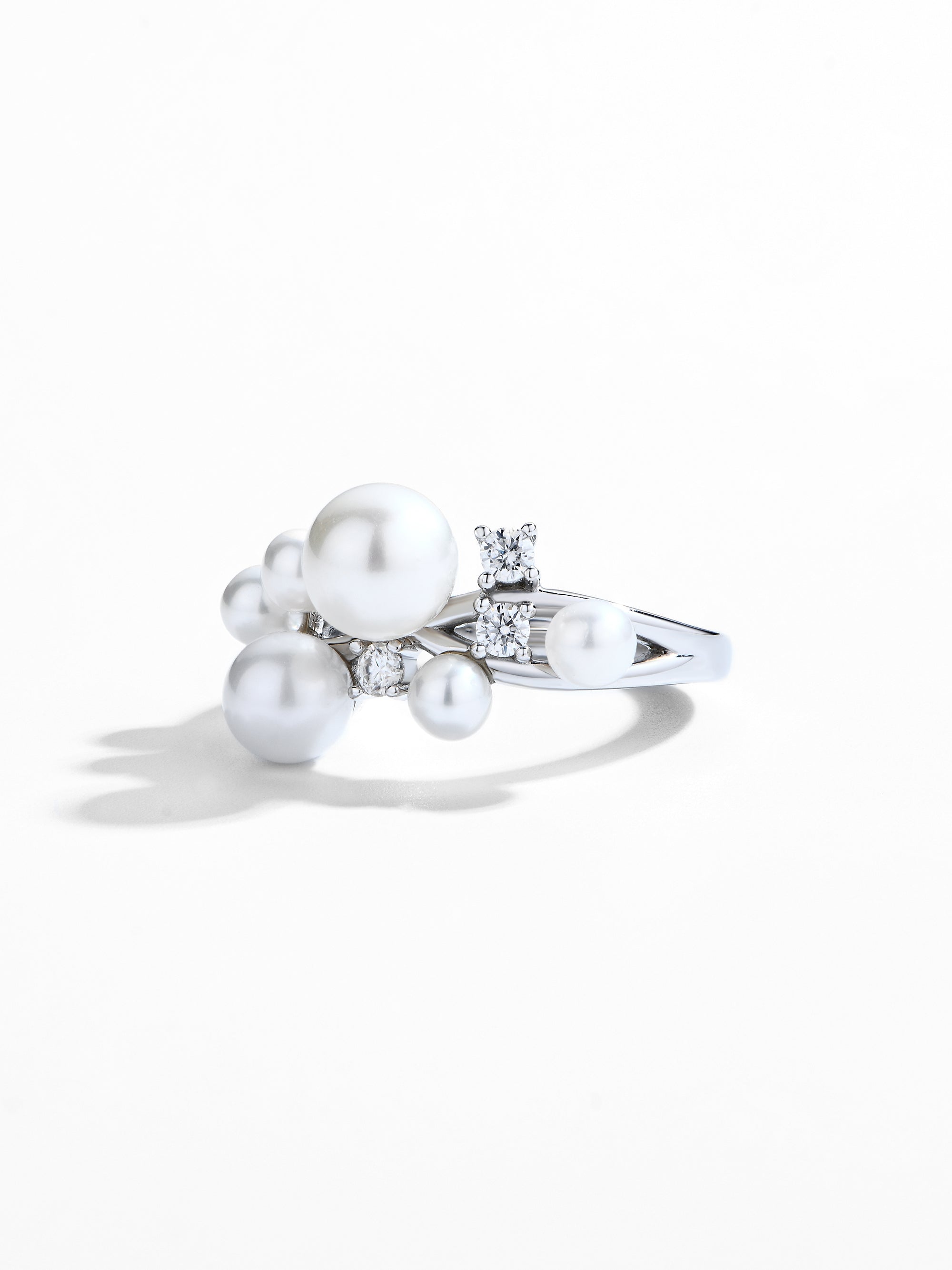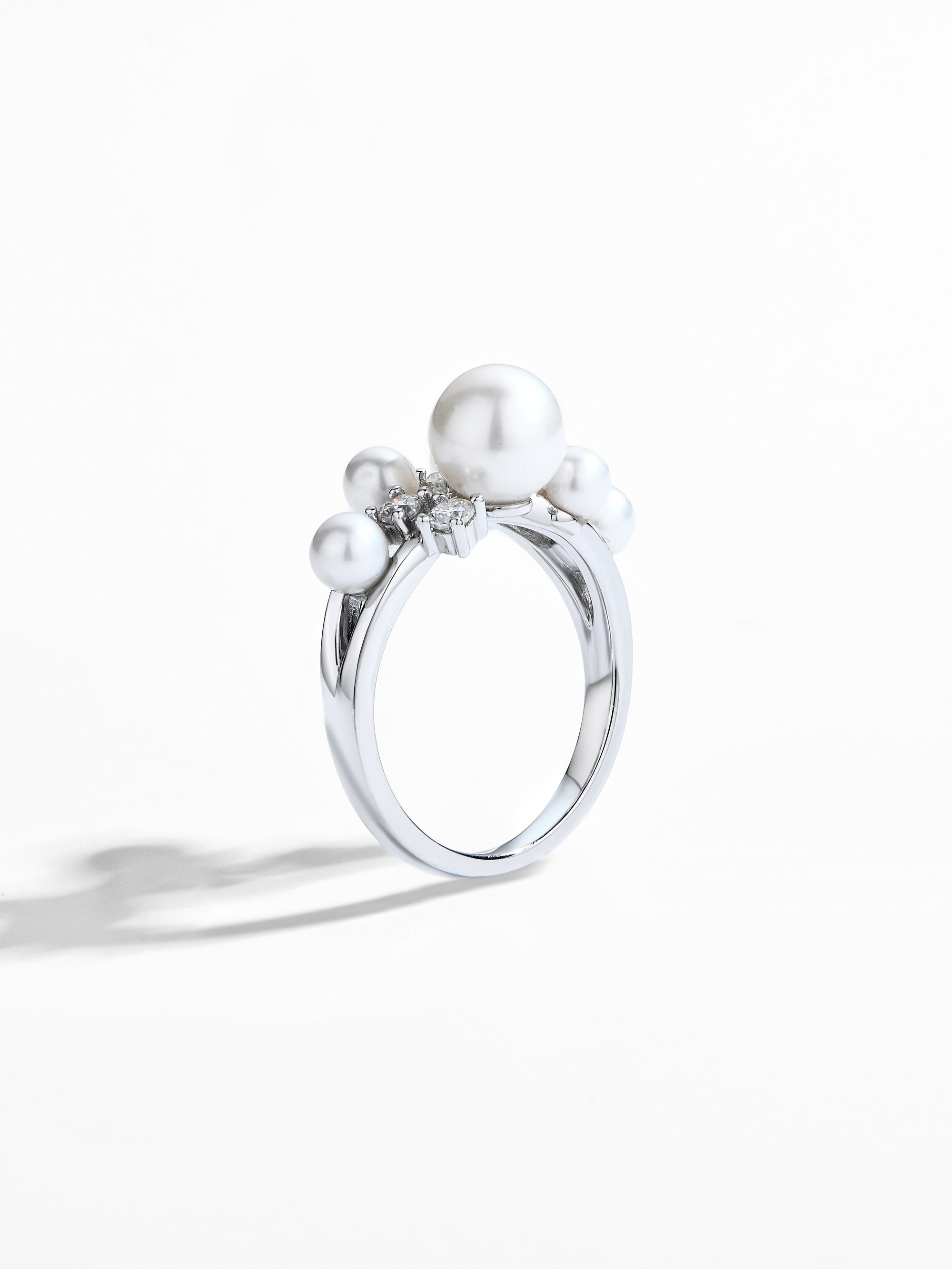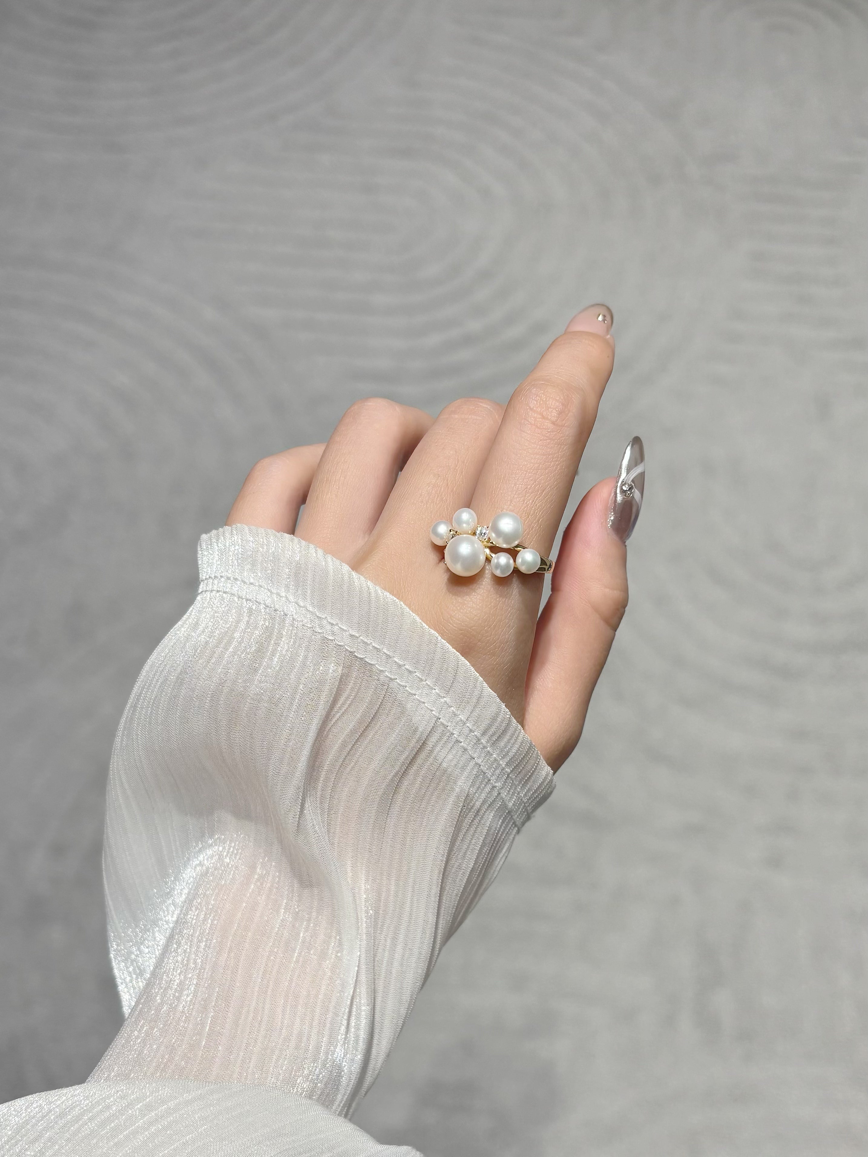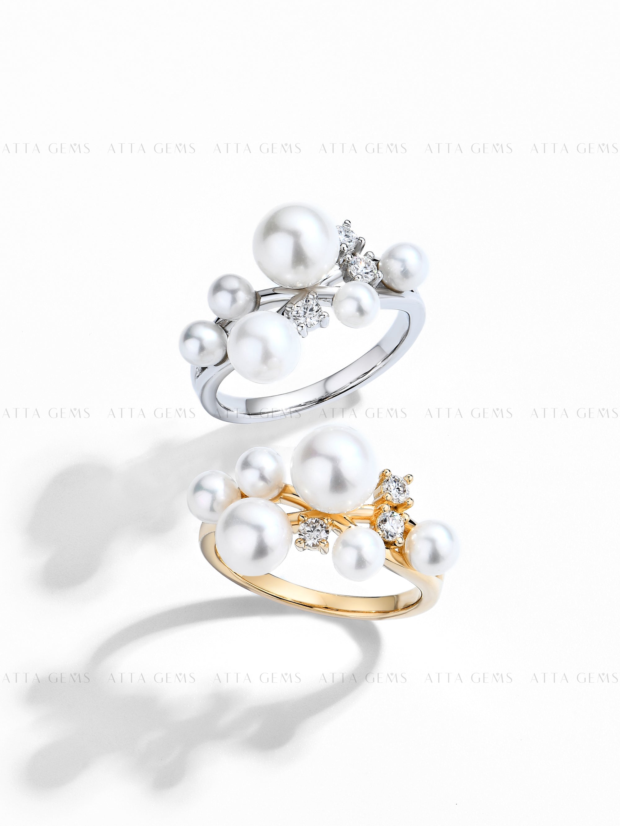 This women's engagement wedding ring showcases a stunning cluster bubble design. It combines 7mm, 6mm, and 4.5mm freshwater pearls for classic elegance with 2.5mm moissanite diamonds for brilliant sparkle, balancing timeless beauty and modern appeal.